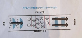 「BLUE POWER 358(ブルーパワー358)」に使っている数種類の鉱石パウダーからはマイナスイオンや遠赤外線、地場など極超周波数の微弱エネルギーが放出されており、この作用によって燃料室に送りこまれる空気中の酸素のクラスターイオンや燃料クラスターイオンを中和し、分散・微細化させることができます。