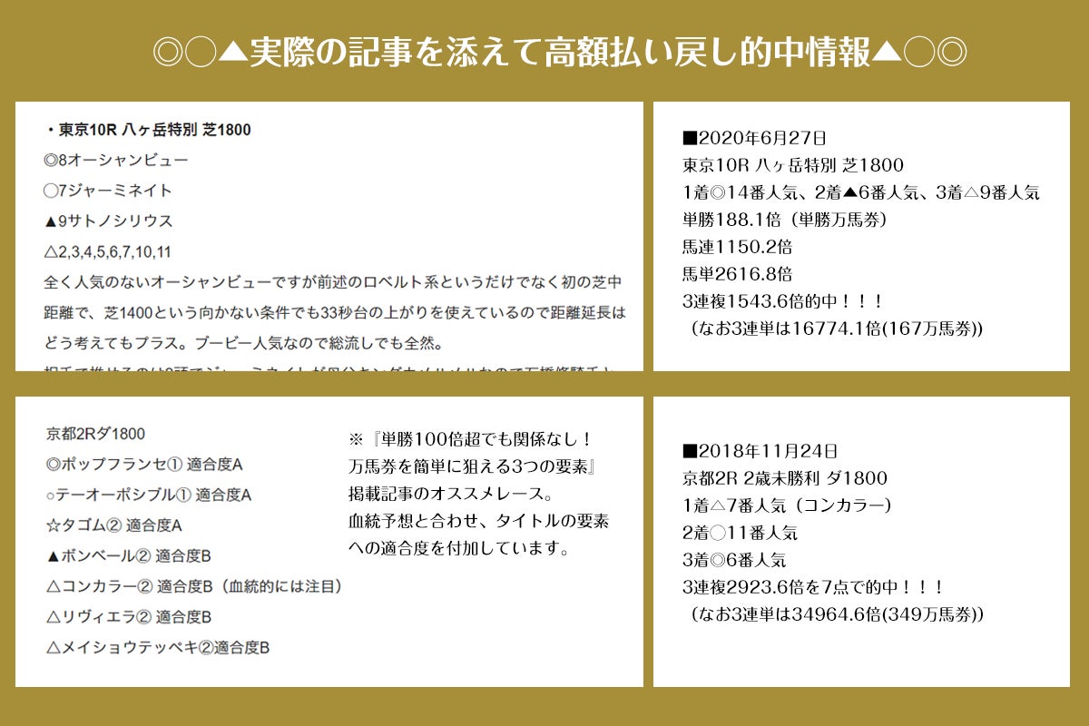 ただもちろん当たらないとその理論に意味無くない??という事になってしまうと思いますが、本腰を入れたペースで掲載しだした本年春以降は毎月何本も掲載記事から万馬券を当てている事もお伝えしておきます。