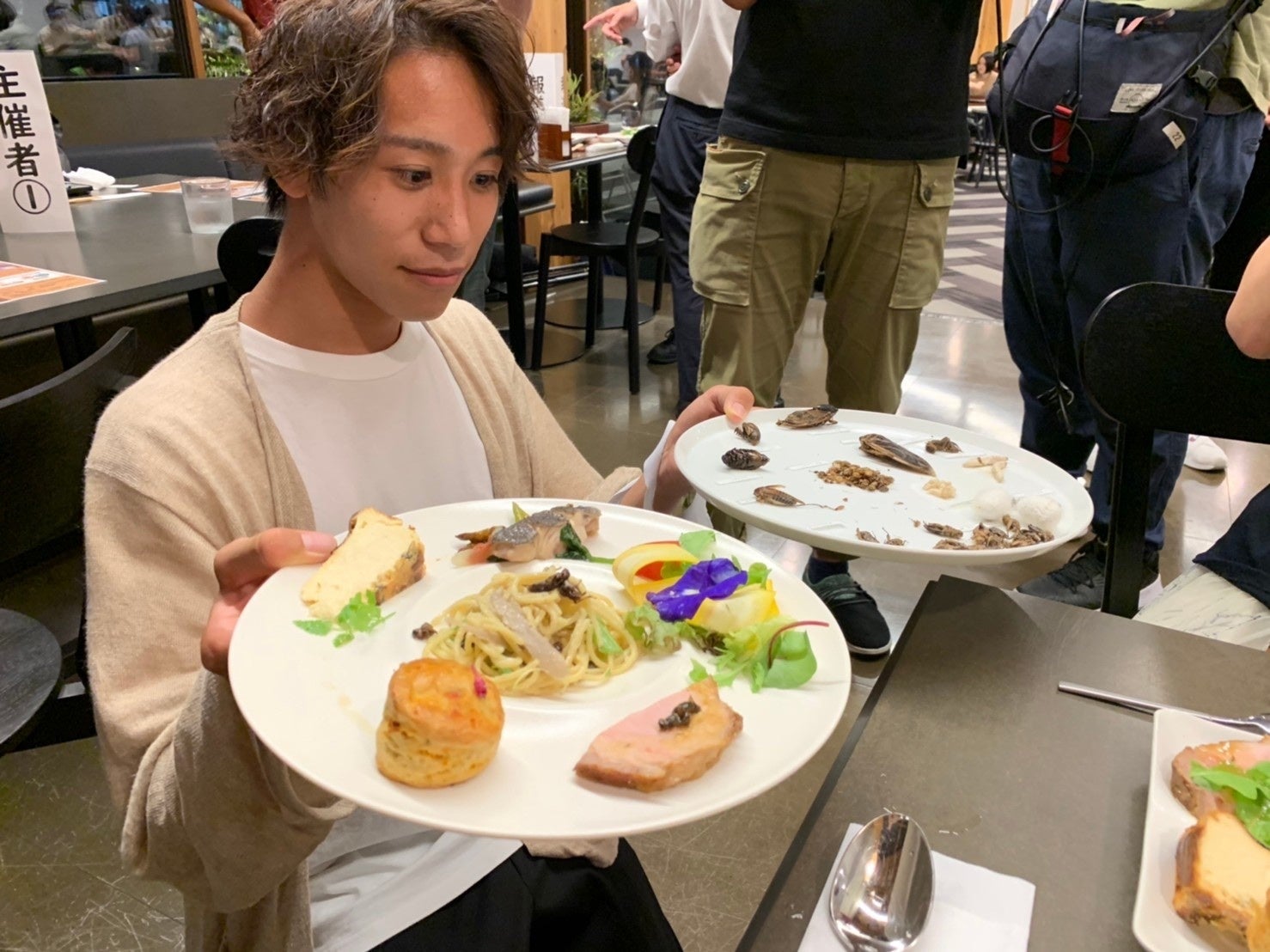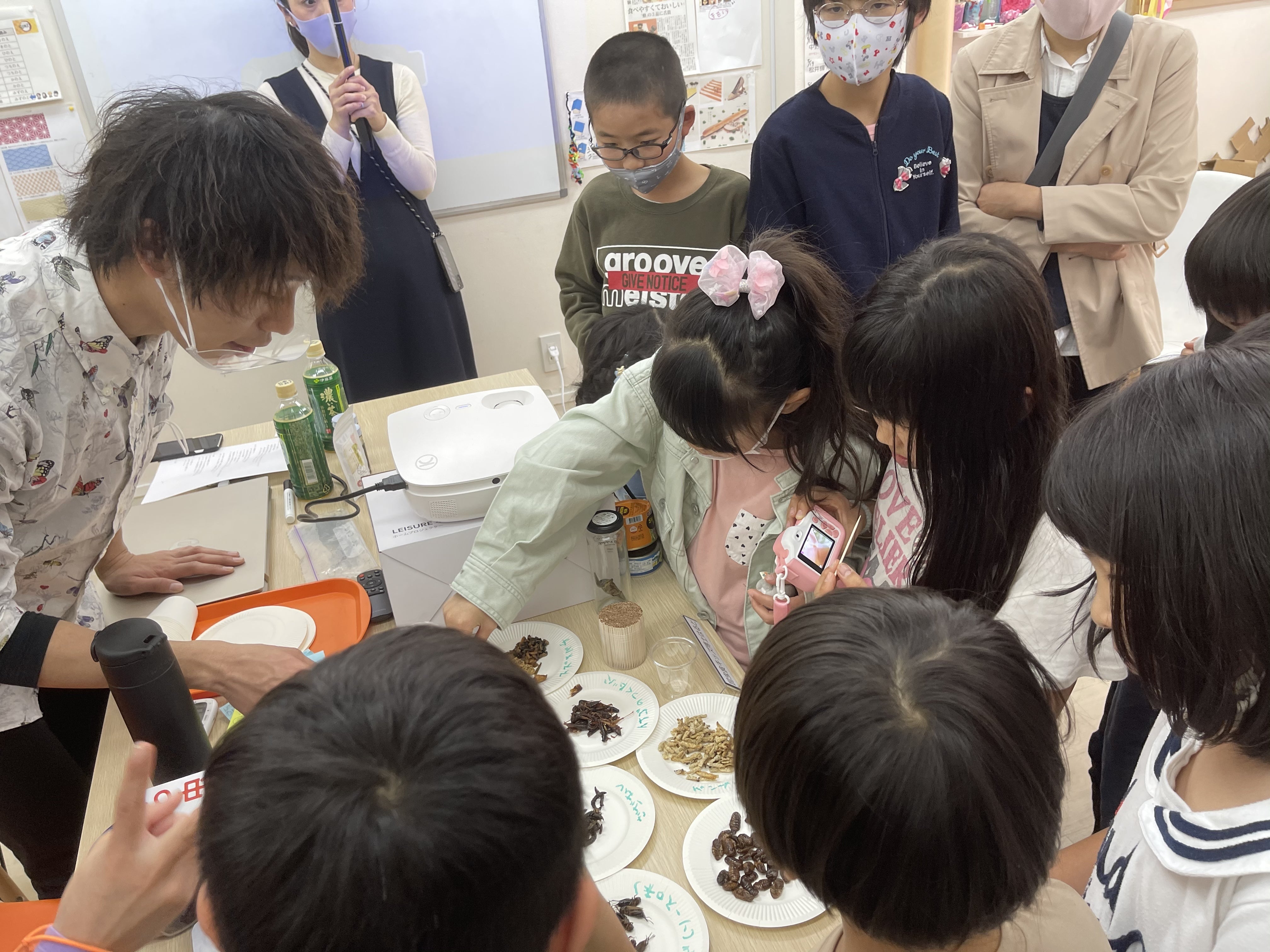 子どもを対象とした昆虫食体験ワークショップの様子経済思想家 斉藤幸平さんへコオロギ料理を振る舞い(手前はコオロギのスコーン、パスタ、カレー)