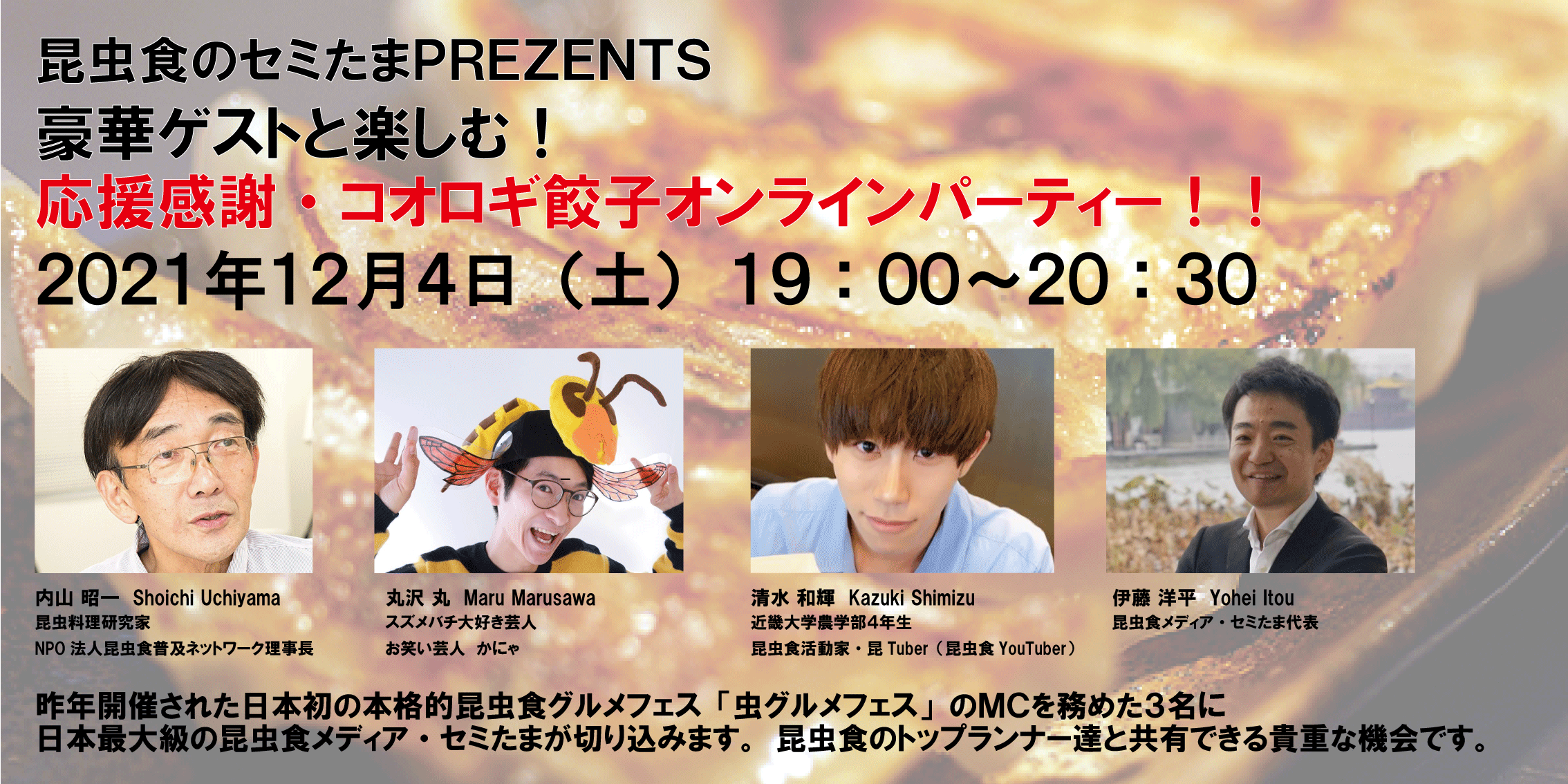 2021/10/30 20:47プロジェクト終了前の最後の投稿となります。このプロジェクトを通じて、1ヶ月間ほぼこれに関するツイートや動画しか上げなかったのですが、嫌がることもなくフォローしてくださった皆さんには感謝でいっぱいです。しっかりこの1年半の活動の成果をお示しできたかなと思っています。さて、いま、関西では、阪急うめだ本店で昆虫食のイベントをやっています。僕ものぞいてきました。こちらは、特に親しくさせていただいているTAKEOさんのブースです。山梨産のカイコのサナギのおつまみが特に美味しかったです(^^)今回は昆虫の姿形を限りなく抑えた形でのイベントのようですが、いずれハードルが下がってくるのではと思っています。昆虫を代表とした『食』の多様性だけでなく、性の多様性やADHDをはじめとした外からはわかりにくい疾患など、さまざまな事情に対して寛容な社会に着実にステップアップしてるのではないでしょうか。今回の餃子は、大阪のイベントで販売されている比較的入門として召し上がりやすい『お菓子』などから、少し先に進んで『食卓のど真ん中』をターゲットにしたものです。きっかけはなんでも良いと思います。ぜひ、みんなでワイワイ言いながら囲んでもらえれば共有してもらいたいなと思います。現在のところ、さまざまな方にご支援いただいています。平素よりお世話になっている昆虫食業界の方や、最近参入された新規の方、タレントさん、そしてYouTuberや講演などで活躍されてる方など、僕と同じく何らかのフィールドで活躍されている方からの応援が多かったのが印象的で、そのような皆さまから評価いただいたこと、大変光栄に思います。また、初期の頃から活動を見守ってくださってる皆様、僕のイベントによく来てくれる中学生や高校生の子どもたちや、今回の取り組みを通じて知っていただいた皆さん。活動の輪が広がっていくこと嬉しく思います。最後まで気を抜かずに頑張りたいと思いますのでよろしくお願いします!! もっと見る