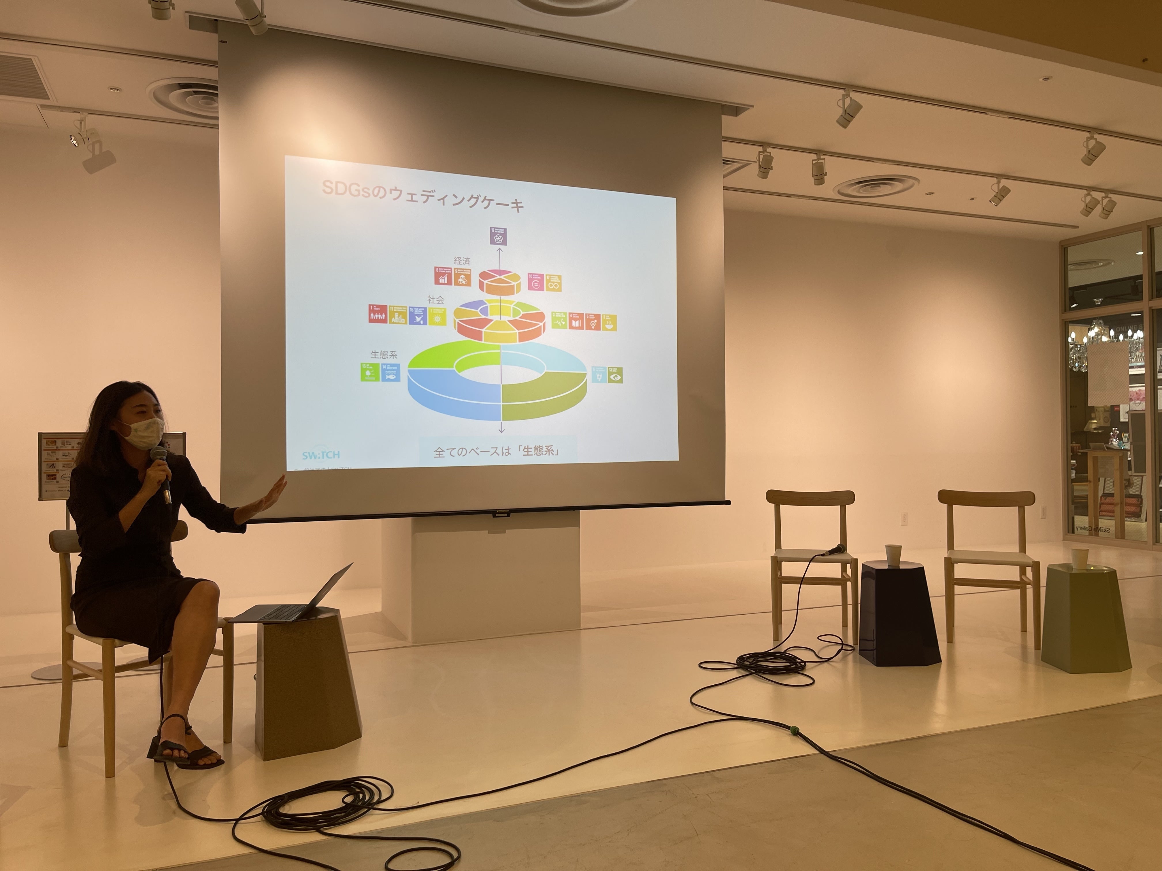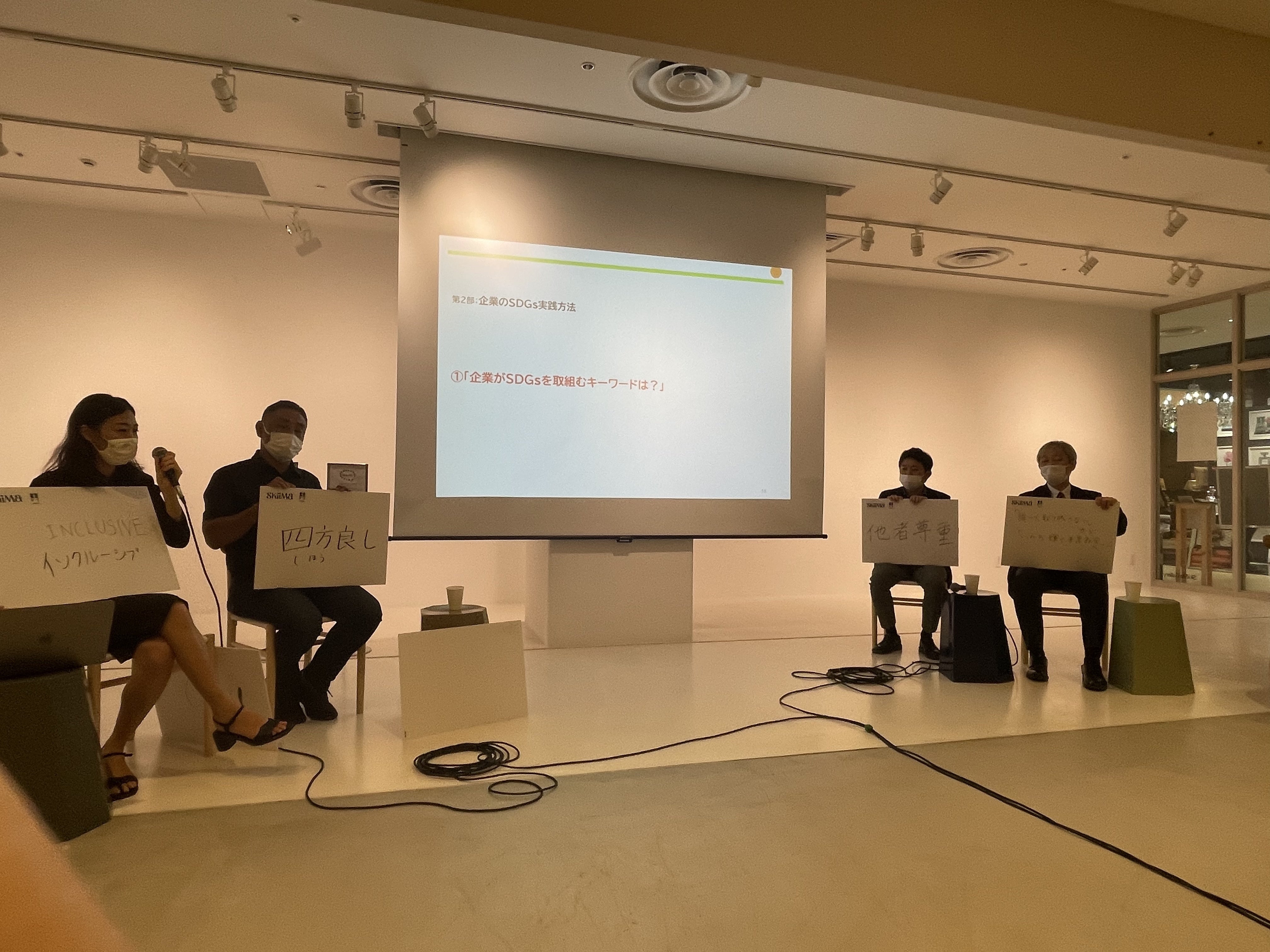 続くトークセッションでは、大阪大学の伊藤武志教授や、今回の企画展示でお世話になっているPARCO、パーシヴァルのお2人を交え、企業がどのようにSDGsを捉えて取り組んでいくのかというお話しでした。
