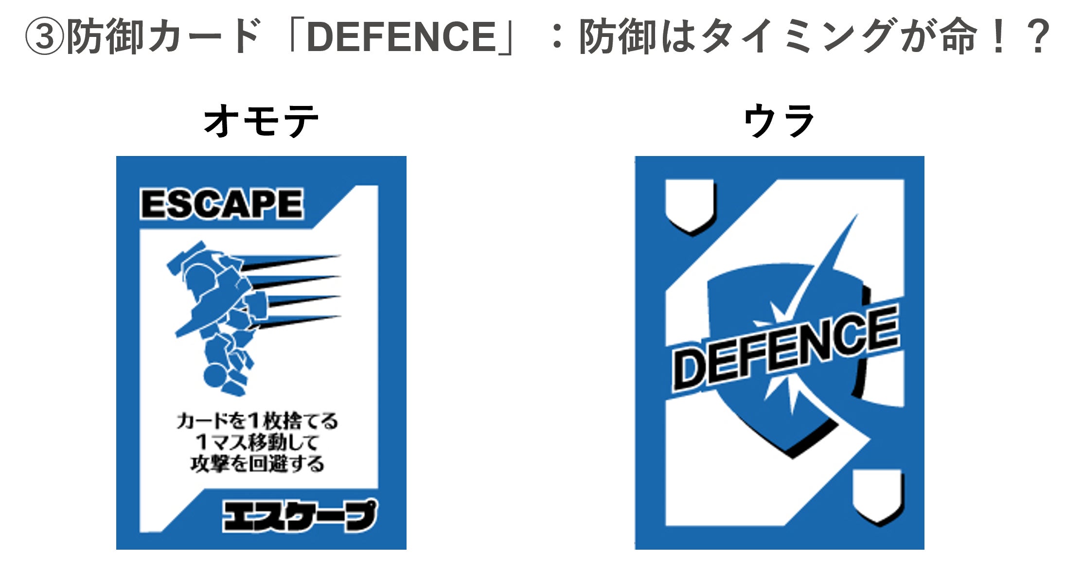 攻撃があれば当然防御もあります。それが防御カードです。ダメージの軽減、無効、回避と、勝利には欠かせないカードですので、必ず1枚は持っておきたいところです。