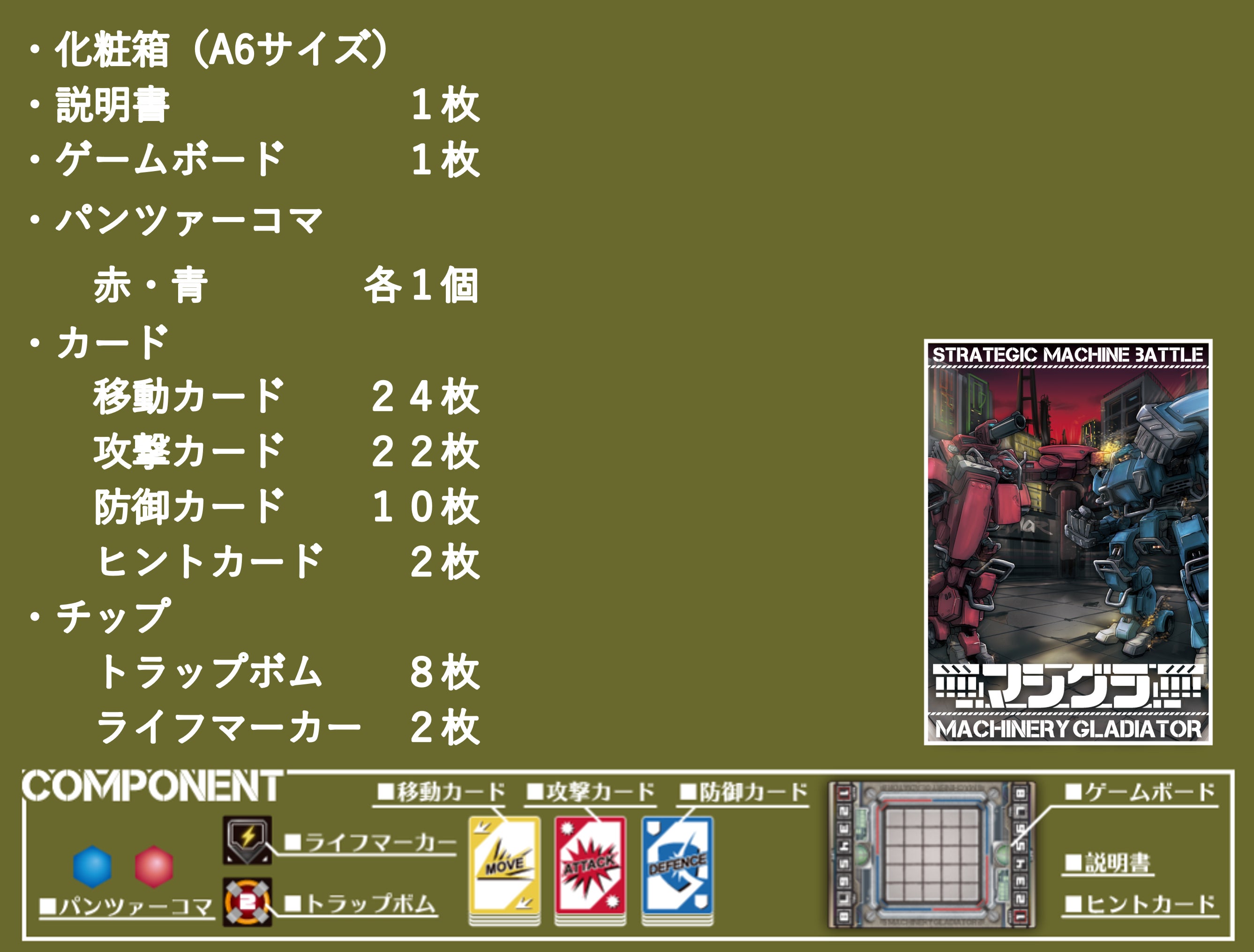 『マシグラ』となったあなたが、5×5マスの闘技場を、移動・攻撃・防御の3種類のカードを使用して「パンツァー」を操縦し、相手を倒せば勝ち、というシンプルなゲームです。