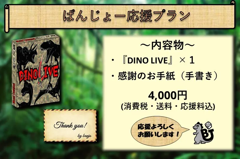 私達はそんな『DINO LIVE(ダイナリブ)』というゲームを1人でも多くの人へ遊んでいただきたく思っています。ただ、私達は今年の初めに結成した無名の製作チームであるため、全く知名度がありません。そこでボードゲームファンの皆様にお願いがございます。