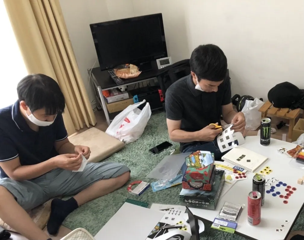 ボードゲーム製作チーム「ばんじょー」は2021年2月の結成から、本プロジェクトの開始までの約7ヶ月間、週に1度集まり、1日8時間以上作業を続けてきました。また、集まりで生じた問題点は宿題として持ち帰り、次の週の集まりまでに行ってくるという作業も含めると人生の自由な時間のほとんどをボードゲーム作製に費やしたといっても過言ではありません。