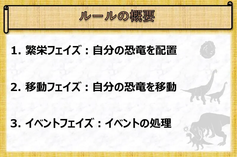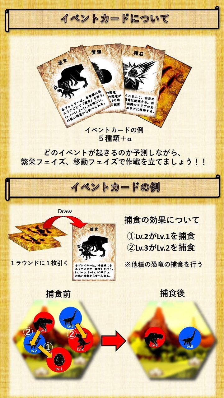 イベントフェイズでは基本的に捕食が行われるため、前述した繁栄、移動フェイズでどれだけ自分の恐竜を減らさずに、相手の恐竜を減らせるポジションに居られるかが大切です。ただ、勝つためには捕食が行われないタイミングを見極め、危険な行動をすることも必要となります。