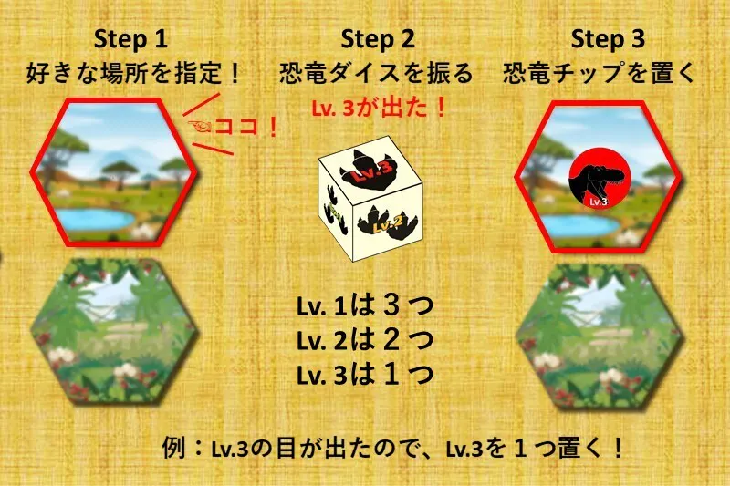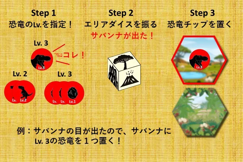 配置したい恐竜のLv.を選択し、エリアダイスを振ります。出た目のエリアにあらかじめ選択しておいたLv.の恐竜チップを配置します。このとき恐竜チップを置く数はLv.3なら1つ、Lv.2なら2つ、Lv.1なら3つです。