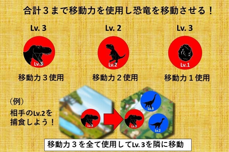 自分の捕食可能なLv.の高い恐竜を他プレイヤーの恐竜に向かわせるのか、自分のLv.の低い恐竜を逃すのか。戦況を見ながら、その都度の最善手をしっかり考えましょう。