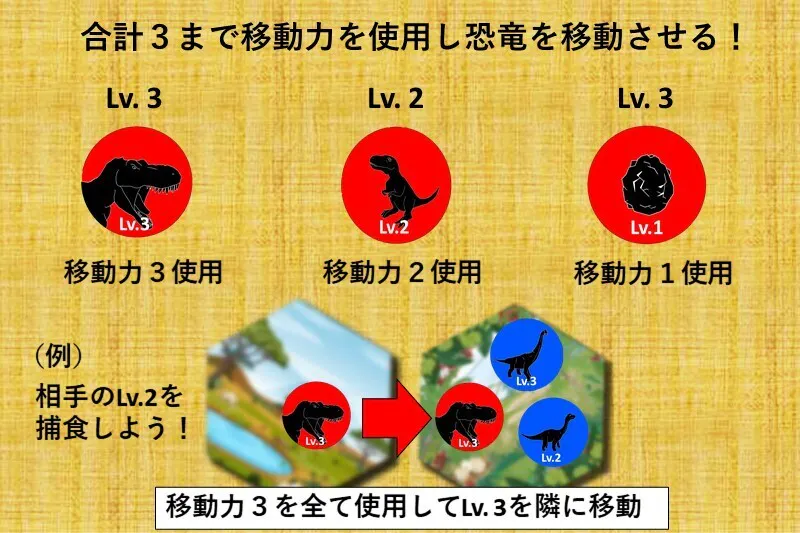 全員の配置が終わると次に移動フェイズに移行します。移動フェイズでは各プレイヤーは合計3の移動力まで自分の恐竜を移動させることができます。