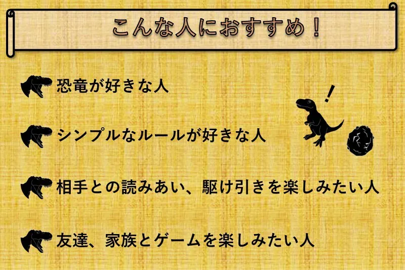 恐竜の生き残りを懸けた戦いをモチーフにしたゲームです。「シンプルなルール」でありながら「熱い駆け引き」を楽しめるゲームデザイン。ワクワクする世界観と面白さの仕掛けを理論的に組み立てた集大成です。ボードゲームが好きな方はもちろん、初めてボードゲームに触れる方へもおすすめの作品です。