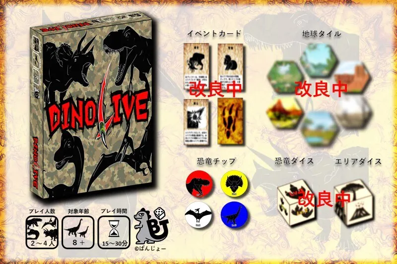 『DINO LIVE(ダイナリブ)』とは、地球というタイル上で恐竜達が生き残りを懸けて戦う弱肉強食型エリアマジョリティボードゲームです。各プレイヤーは恐竜の1種族となり、地球上最大の恐竜種となることを目標にプレイします。「捕食、繁栄、環境変化」といった決して変えることのできない自然の摂理をうまく利用し、生き残りを目指しましょう!