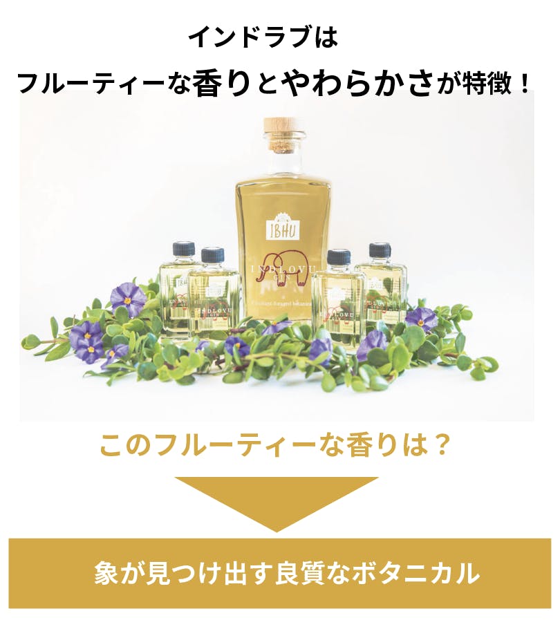 インドラブジンはアフリカ・サバンナに生息する象の糞から取り出したアカシアやアガトスマなどをボタニカルとしています。象の好物であるこれらの植物は、香りの良さはもちろん強力な抗酸化作用(ポリフェノール)を含み、胃腸炎などの内服または下剤として利用される薬草として現地ネイティブの間で珍重されてきたものばかりです。さらに象はその植物の中でも良質で新鮮なものを厳選し食すので、アフリカでは古くから象からのボタニカルは薬として使用されてきました。その上質なボタニカルを抽出してできたのがインドラブジンです。
