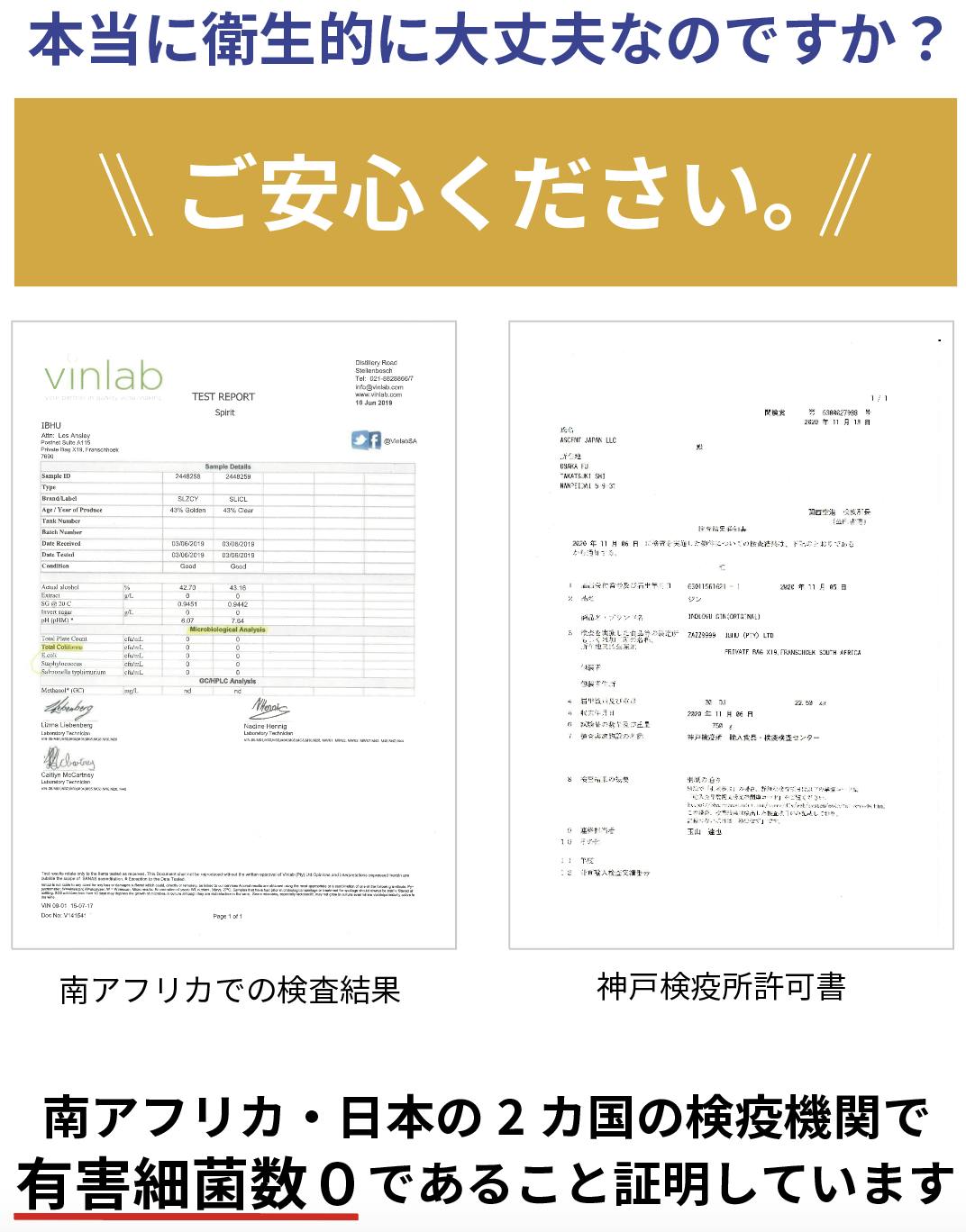 南アフリカと日本、2カ国で衛生機関に検査を依頼し(VinLab社/神戸検疫所)、バクテリア、ウィルスなど有害細菌数が0であることが証明されています。