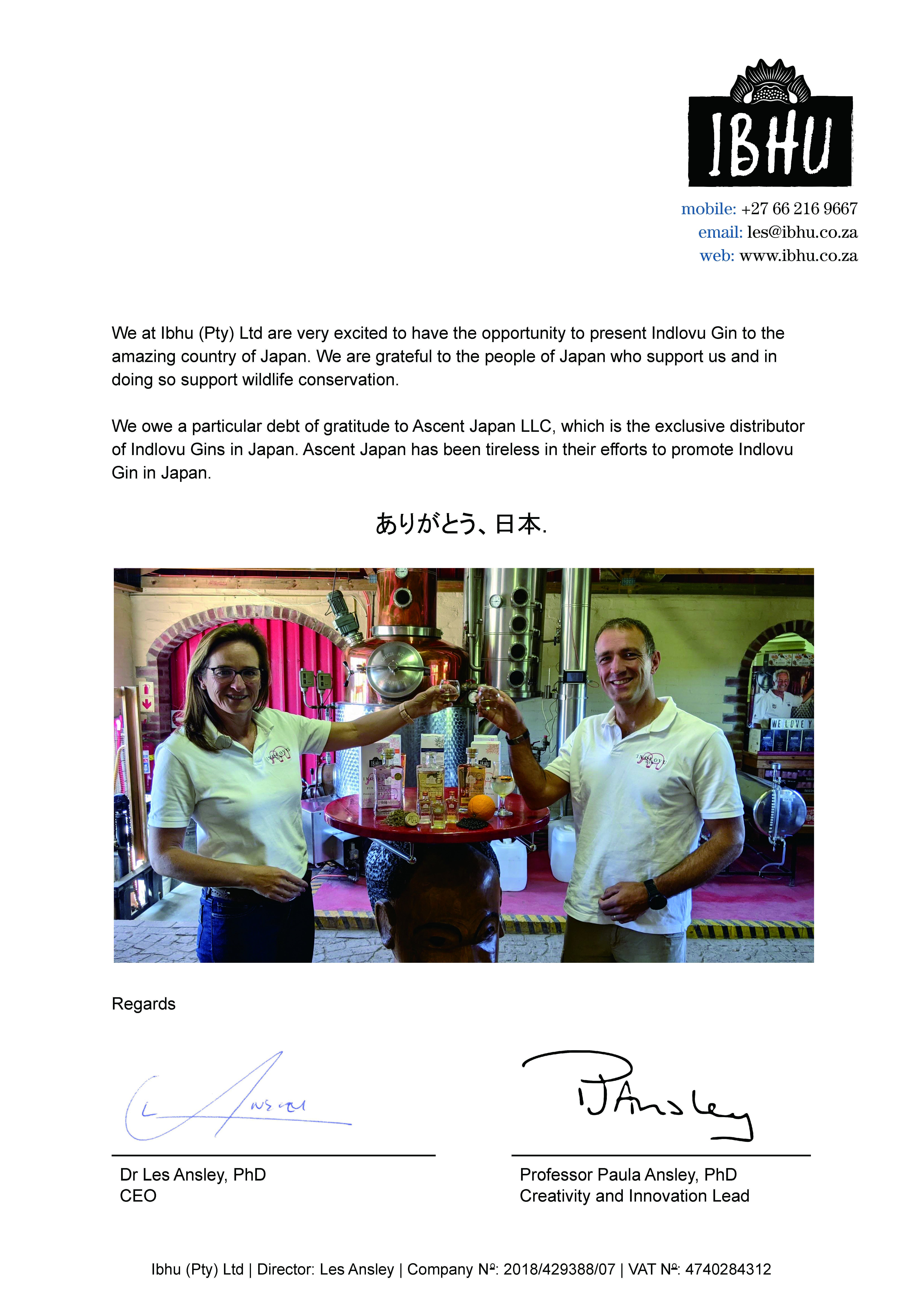 南アフリカのインドラブ・オリジナルジンの開発者である、免疫学博士であり大学教授でもあるポーラ・アンスレーさんと御主人の同じく科学博士であるレス・アンスレー夫妻から、皆さんへのお礼状です。 昨日(10月20日)に到着しました。 内容は;Ibhu社として、この素晴らしい国、日本へ自社のインドラブジンを紹介できることに、この上ない喜びを感じております。 当社並びに、野生動物の保護を支援して下さる日本の皆さんにとても感謝しています。このような機会を与えてくれた日本の総代理店、Ascent Japan LLC(アセントジャパン合同会社)に改めて御礼を申し上げます。 Ascent Japan LLCは、辛抱強い努力をもって、日本での販売・認知活動を行ってくれています。以上ですが、南アフリカからのメッセージ、最後まで見て頂き有難う御座います。