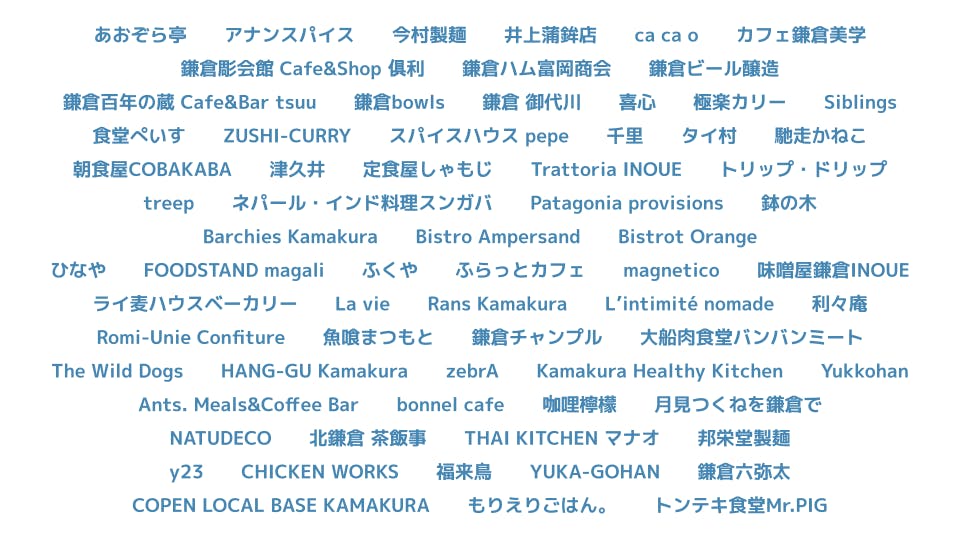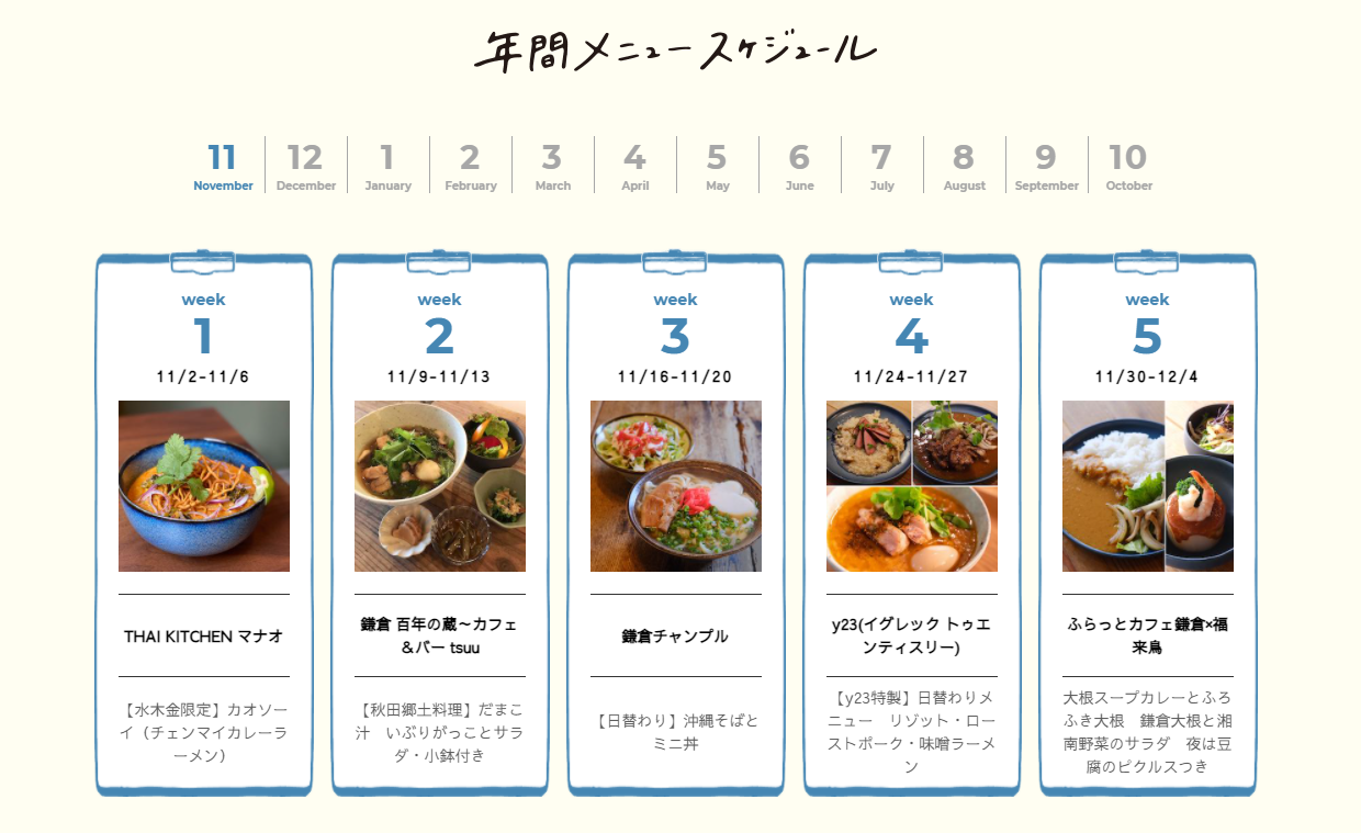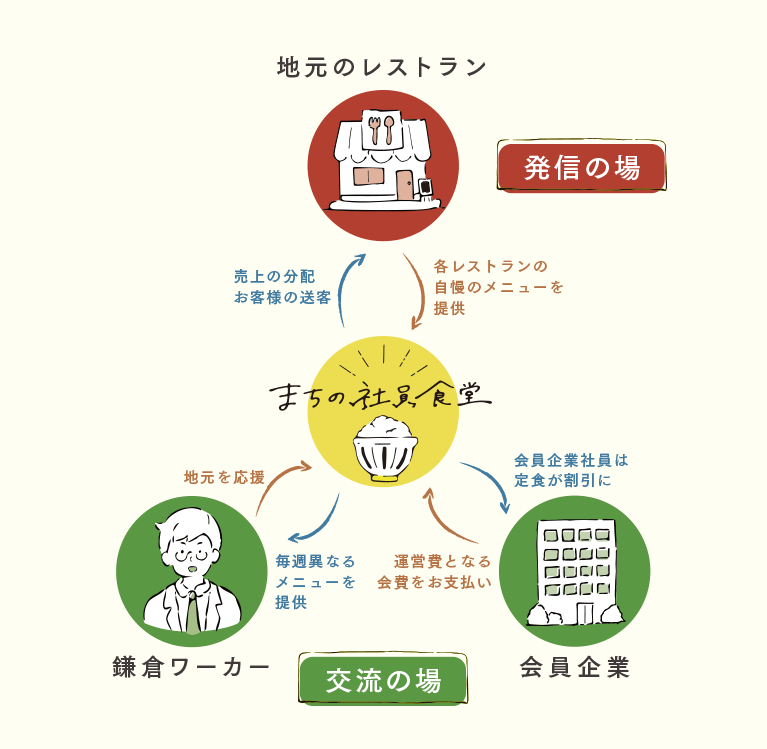 現在は共に運営する会員企業・団体が22社、60店舗近くの飲食店の皆さまにご協力いただき(2021年9月現在)毎週週替わりで地元のお店の味が楽しめる「鎌倉で働く人のための社員食堂」として営業中です!