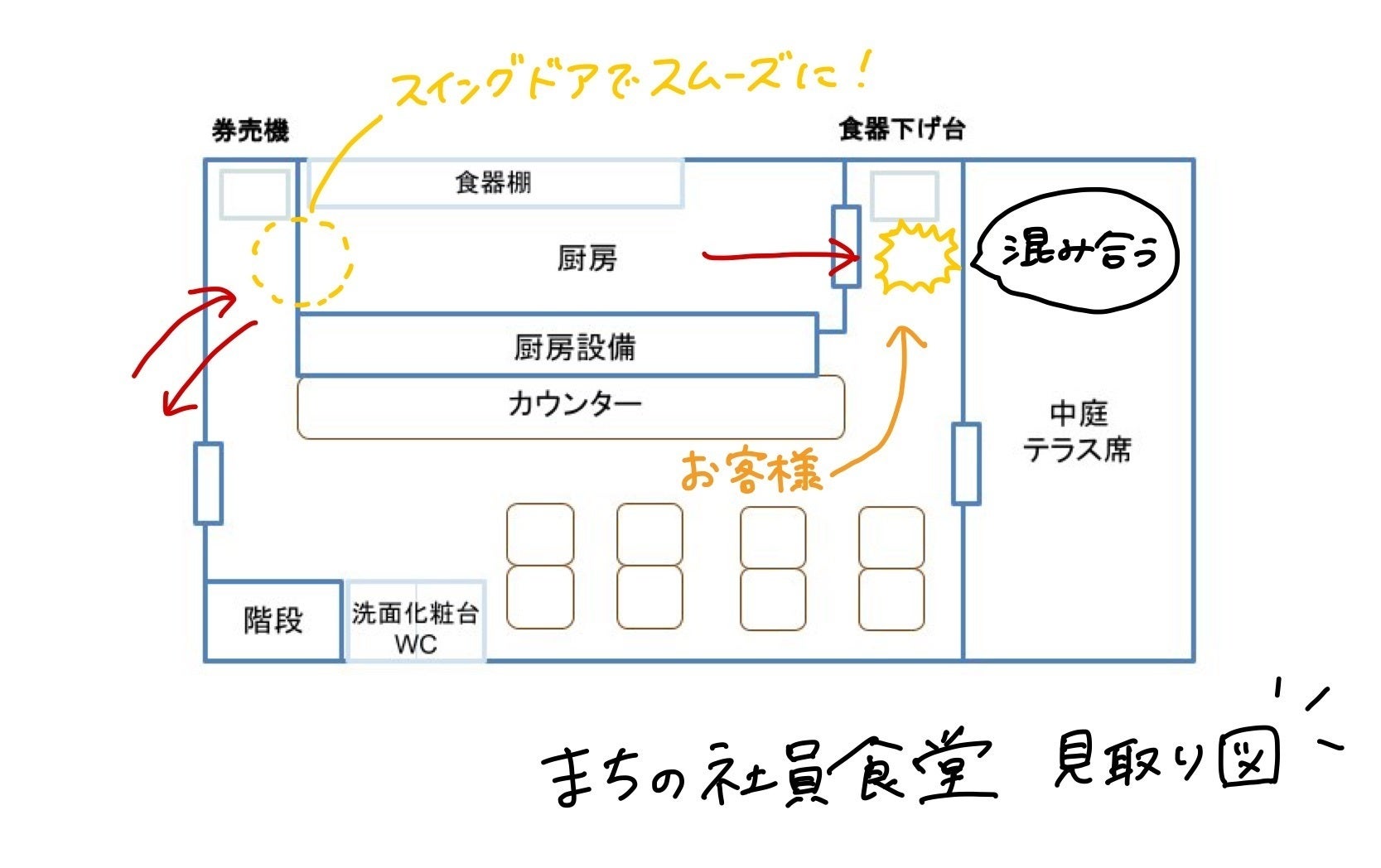 現状、まちの社員食堂の厨房スペースは店内の奥、中庭側一箇所しか出入り口がありません。お客様自身に食器を下げていただく導線とぶつかってしまい、ご迷惑をお掛けすることも多くありました。状況に応じて出入り口を変え、対面接触を減らすことが出来ると考えています。