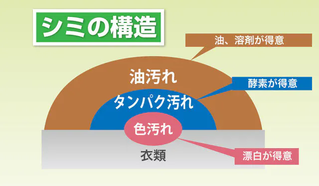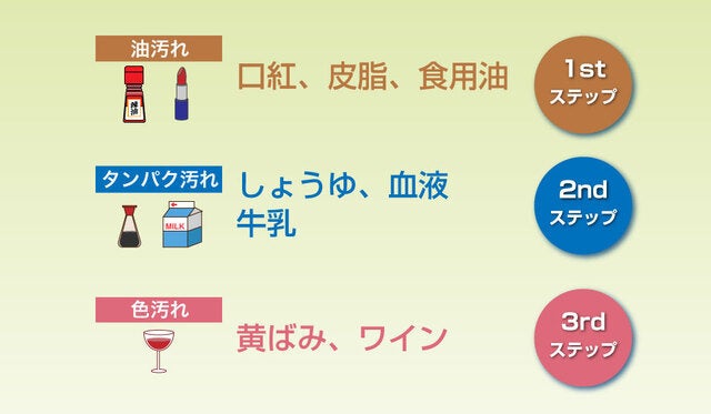 ひとつめは口紅やファンデーション、油性ペンなどに代表される「油汚れ」。ふたつめはしょうゆや牛乳、血液に代表される「タンパク汚れ」。そしてみっつめは、黄ばみやワインなどに代表される「色汚れ」。