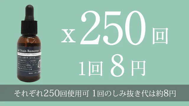 本セットでは、それぞれ250回ずつ使用可能です。1つのしみ抜きにかかるコストは8円。一般的なクリーニング店では1箇所のしみ抜きに500円かかるので、コストは段違いに安く済みます。