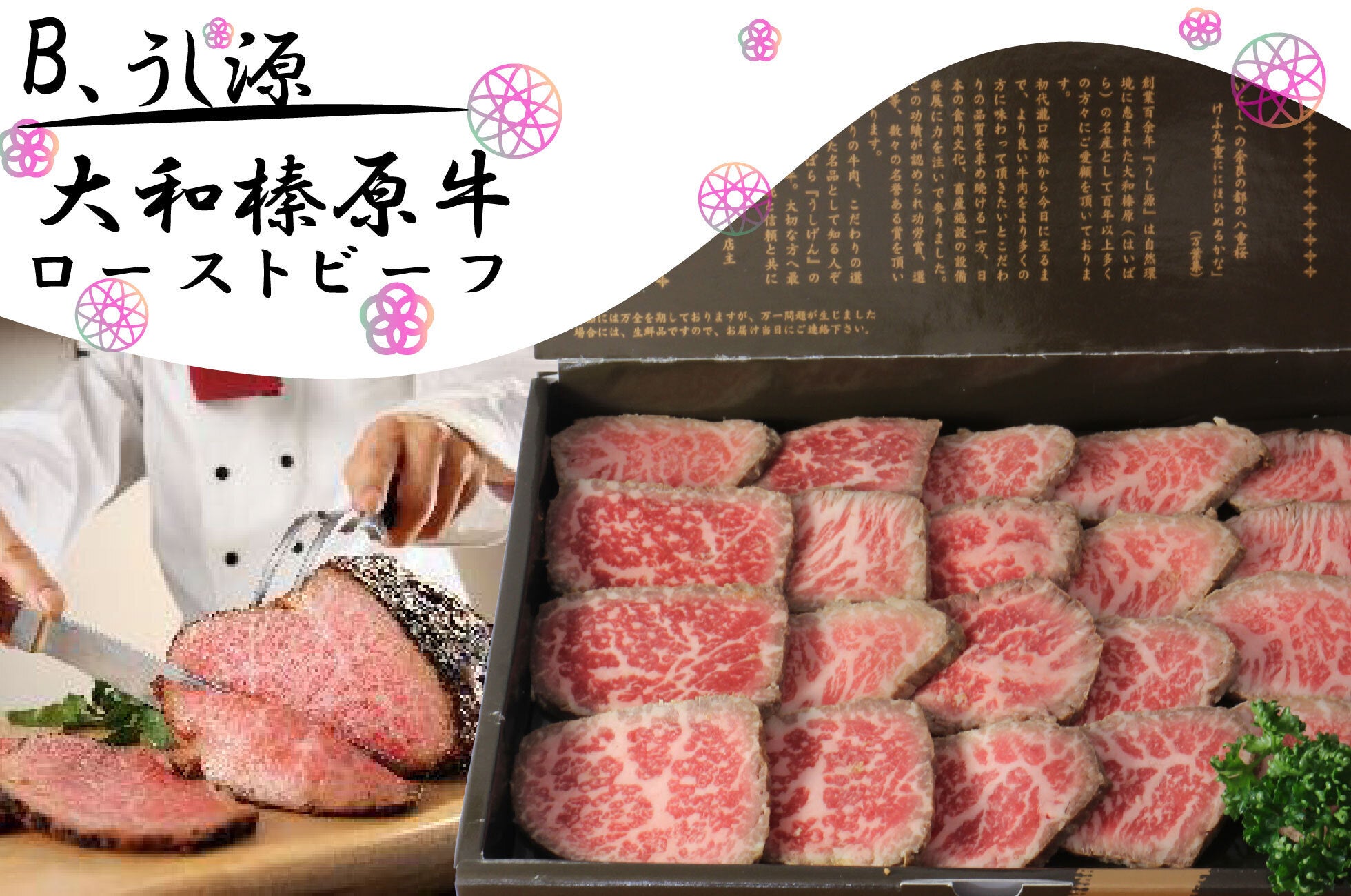 大和榛原牛のもも肉を使い、肉料理うし源のシェフが焼き上げる贅沢な一品です。素材に合わせた火入れをし、素材の味を楽しんで頂きたいという想いで焼き上げたローストビーフ。