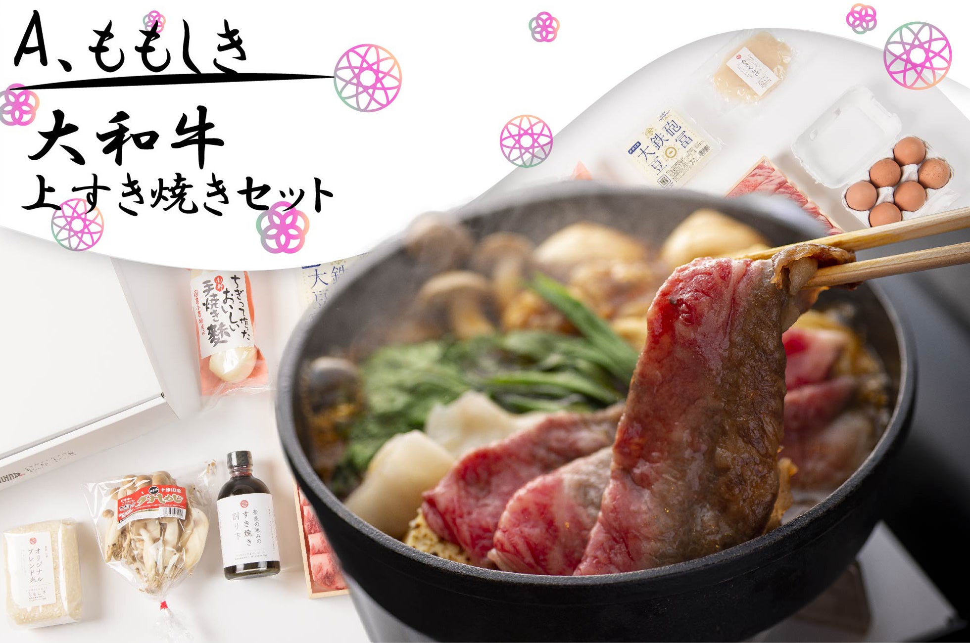奈良の恵みがつまった、すき焼きセット。大和牛はさることながら、まわりの名脇役も美味です。和牛の雌牛で、コク豊かに、やわらかく。心ゆくまで、とろける大和牛をご堪能ください。