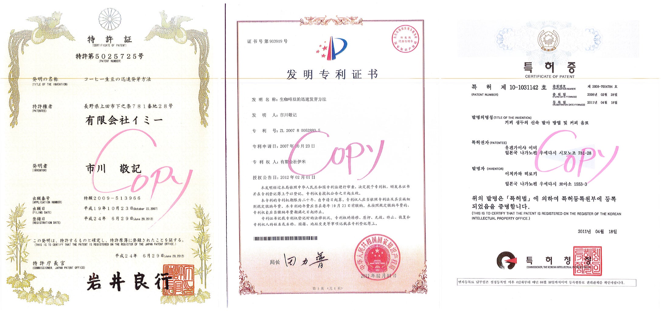 試行錯誤の末に「発芽コーヒーの迅速発芽方法及び飲料並びに発芽装置」として2006年に国際特許を出願し、2011年には韓国、2012年には中国と日本にて特許を取得いたしましました。