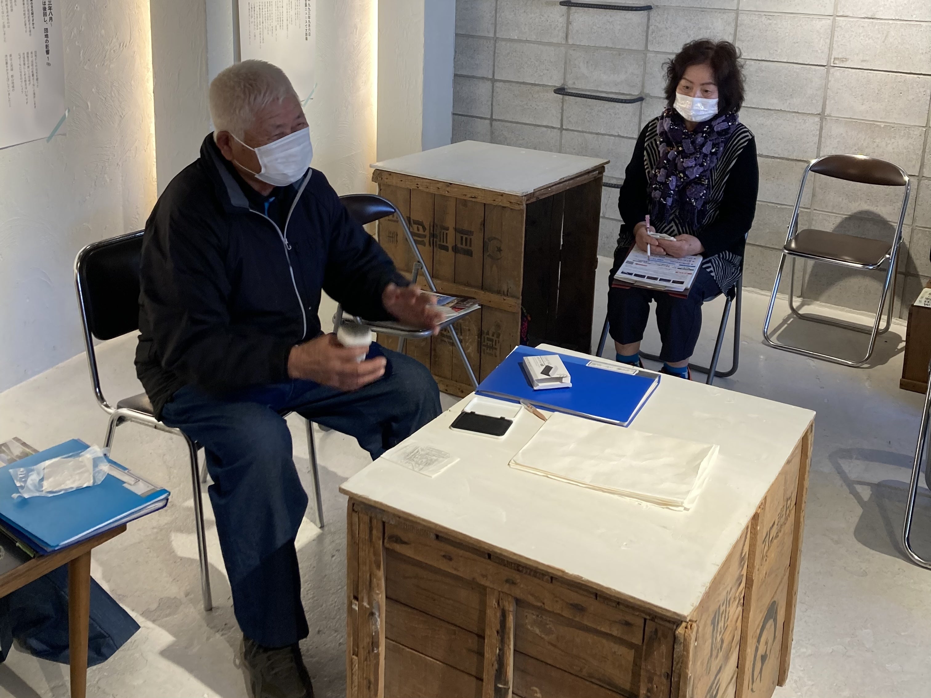 野添さん(桜島の画家)のラジオ放送をキッカケに拓本の活動に参加したこと。当時経紙屋さんだった石原さんは、今回展示する拓本のコピーを刷り続けコピー機を2台潰し、時には機動隊に強制排除されたことことなど、当時の活動を優しい口調で語ってくださいました。