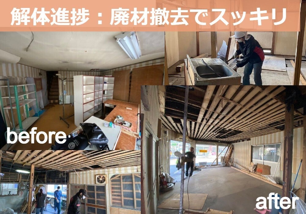 11/7(日)、午前中からまた集まり、解体×廃材撤去の作業を進めました!この日は親戚&家族、合計6名での作業!日曜しかお休みのない方もいるのに毎週来てくれて、、本当に感謝…m(__)m先週崩した床や壁や天井の廃材を集め、クリーニング屋さん時代に使用していたカウンターさんを解体してさよなら。妹も古くなったシンクの解体にチャレンジしてましたが、なかなか全体を壊すのは女性の力では難しく、途中から父がヘルプしてくれました。ありがたい…。クリーニング時代の家具などが残る状態のbeforeから、すっきり広々となったafterを比較すると、ここまでがんばったな!ト思いがひしひし・・・もちろんまだまだなんですけどね笑一歩一歩の進化と小さな目標達成を喜びながら進んでいくほうが楽しいですからね♪クラウドファンディングも一歩一歩。。!応援×シェア大歓迎です♪引き続き楽しんで頑張ります(=゚ω゚)ノよろしくお願い致します!