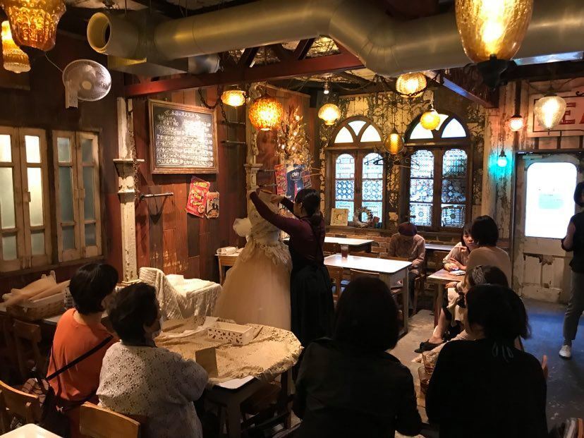 過去に主催したアートイベントの模様:ドレスを仕上げるところをお酒を楽しみながらライブで見る