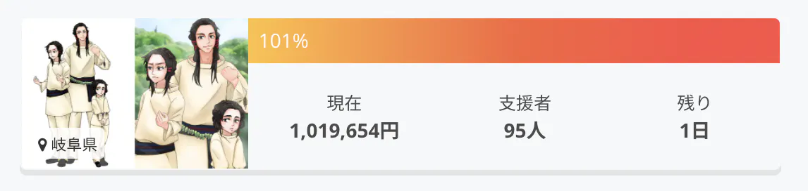 2021/09/12 20:47ご支援いただいた皆様へ●ご報告107名の皆様から1,085,621円のご支援をいただき、無事クラウドファンディングが成功し、終了することができました。とても嬉しく感じております。改めまして、この度は誠に有難う御座いました。クラウドファンディングが終了して、皆様のお名前がようやくわかりました。今回、あたたかい応援のお言葉と決して安くはないご支援を頂けたこと、お一人お一人の名前を拝見しながら感謝しております。また期待をいただいていることを自覚しこれからの活動に対する責任を感じております。一つずつ積み重ねながら進んでいく所存です。●リターン品について、今後のスケジュール・目標についてリターン品発送情報も含め、今後のスケジュール等をお知らせいたします。下記の内容になります。リターン品は今しばらくお待ち下さいますようお願い申し上げます。※文章量が多く読みづらい部分もあるかと思います。もしご不明点等ありましたら下記のお問合わせ先までお気軽にお電話ください。【今後のスケジュール、目標】2021年●9月・9月20日頃 マンガのネーム入れ完成 40ページほどを集英社のヤングジャンプに持ち込み スペシャルサンクス方のWEBページお名前掲載・9月下旬 お礼の手紙、イラスト写真、宿儺かぼちゃの発送 ※リターン品は選択された内容により異なります。 ●10月・委員会の開催10月1日金曜日、場所は村半にて、時間は19時〜20時を予定・スクナの味(飛騨の特産を使った米粉の蒸し菓子)非常事態宣言の状況にもよりますが、10月中にイベントにて出店して小学生限定でお菓子の無償配布を考えております。もし余った場合は大人の方々にもお配りできたらと考えております。ここでのアンケートをもとに改良をしていきます。また、現在「すくなつめ」という白いお菓子を開発中です。こちらもイベントにて無償配布を考えております。好評いただいた場合、販売も視野に入れていきます。・マンガ両面宿儺10月末までの集英社さんからの返答により以下の2つのパターンになります。①ヤングジャンプへの掲載決定→マンガのリターン品は、集英社さんの意向に沿いながら製本されてから発送させていただきます。このような理由で、しばらくお待ちいただくこと、現段階ではお渡しできる時期をお伝えできないことを予めご了承ください。②ヤングジャンプへの掲載不可との返答の場合、お返事がない場合→自費出版にて作成。12月中旬までにはリターン品として発送いたします。また、高山市の小学校、放課後児童クラブに1冊ずつ無償配布予定です。教育委員会さんからは了承いただいております。・歴史、伝承調査諸先輩方のお話を聞かせていただき、書籍をもとに勉強し、飛騨の地をめぐりながらできる範囲でYoutube等で発信していきます。●11月・諸団体とのコラボ企画、プロジェクトの準備・マンガの製本作業(ヤングジャンプ不掲載の場合)●12月・中旬 マンガのリターン品発送(ヤングジャンプ不掲載の場合)・中旬 マンガの小学校等への無償配布開始・下旬マンガ両面宿儺 販売開始・24日 劇場版 呪術廻戦0(ゼロ) 全国にて公開●2022年・定期的なイベント開催(お菓子、体験、教室、etc)・マンガの第二弾、第三弾を検討・お土産品の開発、製造、販売・グッズ作成、販売・目標委員数 500人●2023年・「宿儺ショップ」オープン●2024年〜2030年・映画両面宿儺 公開を目指す・目標委員数 5000人====================================================※イベントは各種団体と共に行なっていきます。※製造、販売等は他の団体、企業とコラボすることも検討していきます。【委員募集のお知らせ】当委員会は委員になってくれる方を随時募集しています。活動参加は任意、会費はありません。参加条件は当委員会の趣旨に賛同いただいていることのみです。2月に1度ほど、定期的に委員会を開催する予定です。活動報告やイベント開催について話し合い、歴史の勉強会などをする予定です。今のところ第一回目の開催は10月1日、場所は村半(岐阜県高山市下二之町6)、時間は19時〜を予定しています。※コロナの感染状況等によりオンライン(ZOOM)開催になります。現在20名の方々が参加してくれています。参加希望の方は、下記のお問合せ先までご連絡ください。【個人情報の取り扱いについて、メール配信について】今回のクラウドファンディングでいただいた個人情報はリターンの品の発送のために利用し、今後の活動報告、お知らせ等のメールのためだけに利用させていただきます。それ以外には利用せず適切に取り扱いを致します。もしメール配信を希望されない場合は、お手数ですが下記のお問合せ先までご連絡ください。※当委員会からのメールは「info@ryomen-sukuna.com」で届きます。メールを受信できる様、ドメイン設定を解除して頂いただくか、又は当委員会ドメイン『ryomen-sukuna.com』を受信リストに加えていただきますようお願い申し上げます。【最後に、飛騨高山両面宿