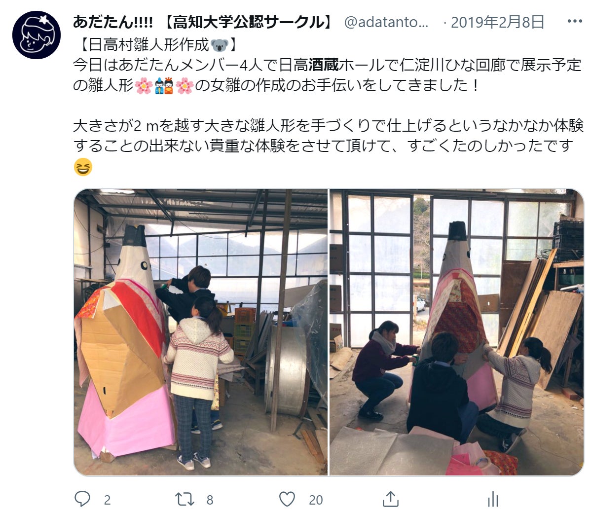 毎年3月のひな祭りに合わせて、酒蔵ホールにて行われている「日高酒蔵ひなまつり」。このひな祭りであだたんは、全長2mほどある巨大ひな人形作成を酒蔵ホールの館長さんと協力して行っております。