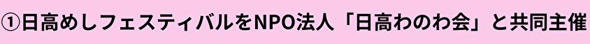 ①の日高メシふぇすてぃばるは、「飲食を主催とした活動」を行ってはならないという学校の規定から、昨年度は主催ではなくご協力と言う形を取りました。
