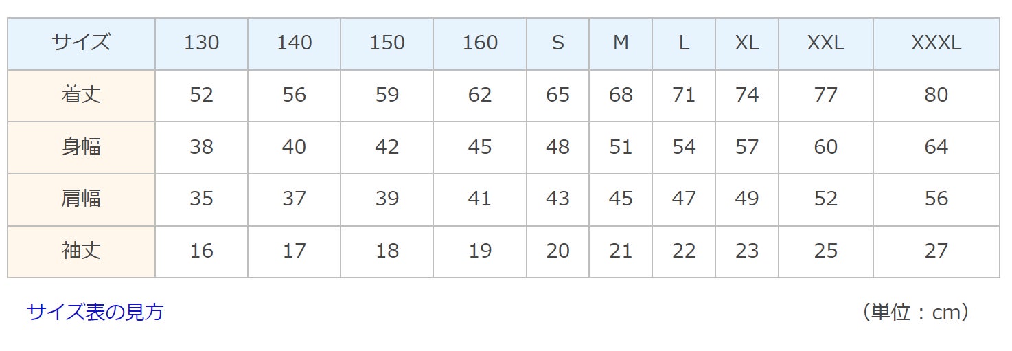 Tシャツのサイズ一覧表(株式会社 テルミ公式HPより引用)