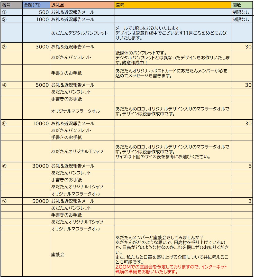 もし開催が難しい場合は、イベント開催費263,555円の中の視察費104,000円を除いた159,555円を使用し下記の「あだたんオリジナルグッズ」ご提供いたします。