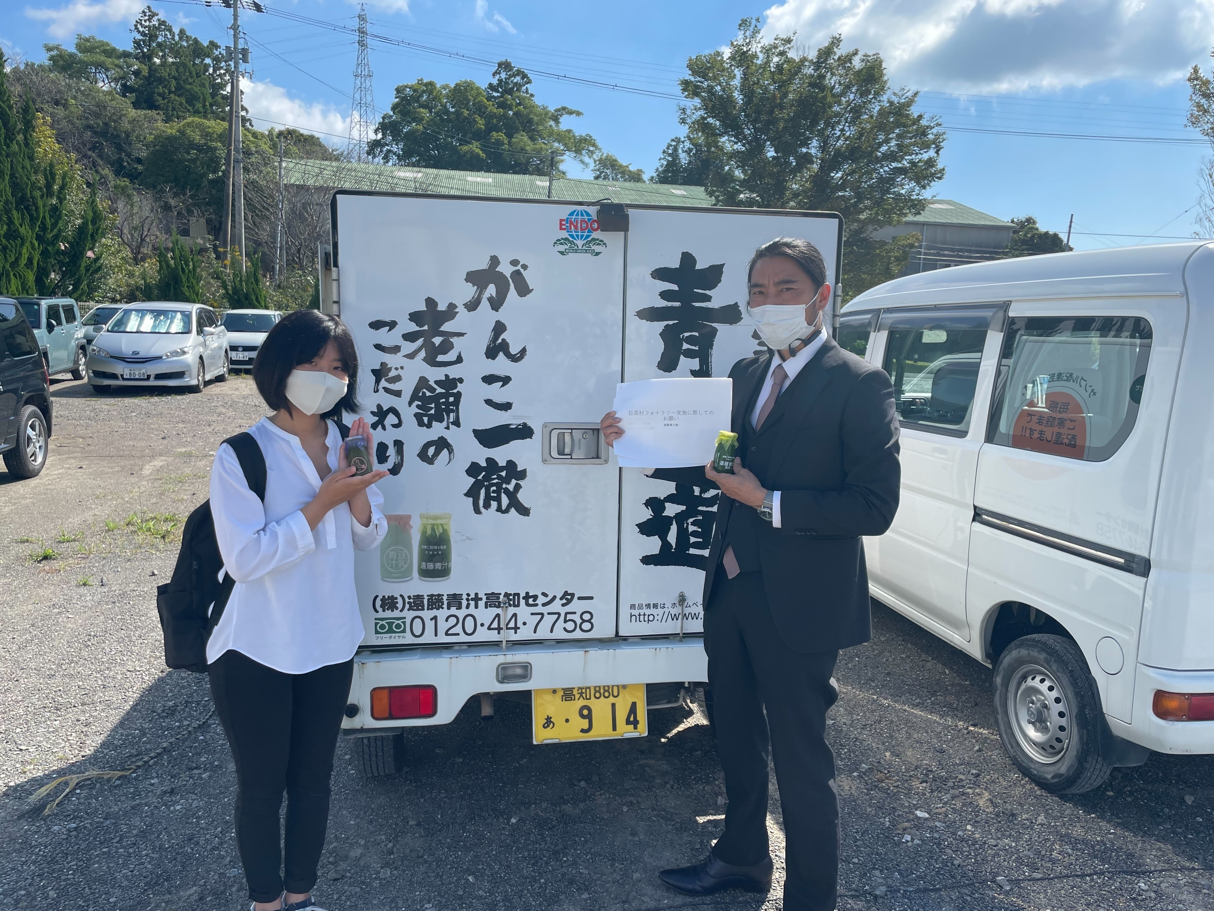 大報告③!!!株式会社遠藤青汁高知センターさんに協賛として応援していただけることになりました!!!遠藤青汁さんは、あだたん内で青汁の葉っぱ「ケール」を育てている学生団体「プロジェクトK」さんに入っているメンバーがおり、今回のクラファンの状況等ご相談をさせていただきました。本当に、野村社長、統括部長内田さんをはじめとした遠藤青汁の皆さんありがとうございます。私がプレゼンを行った際も、社長や内田さんが非常に熱く親身にお話を聞いてくださってさらに身が引き締まる思いでした。最後は、社長と一緒に遠藤青汁を飲んで握手をさせていただきました!青汁美味しかったです♪遠藤青汁様今後ともよろしくお願いいたします。もっともっと、頑張ります!