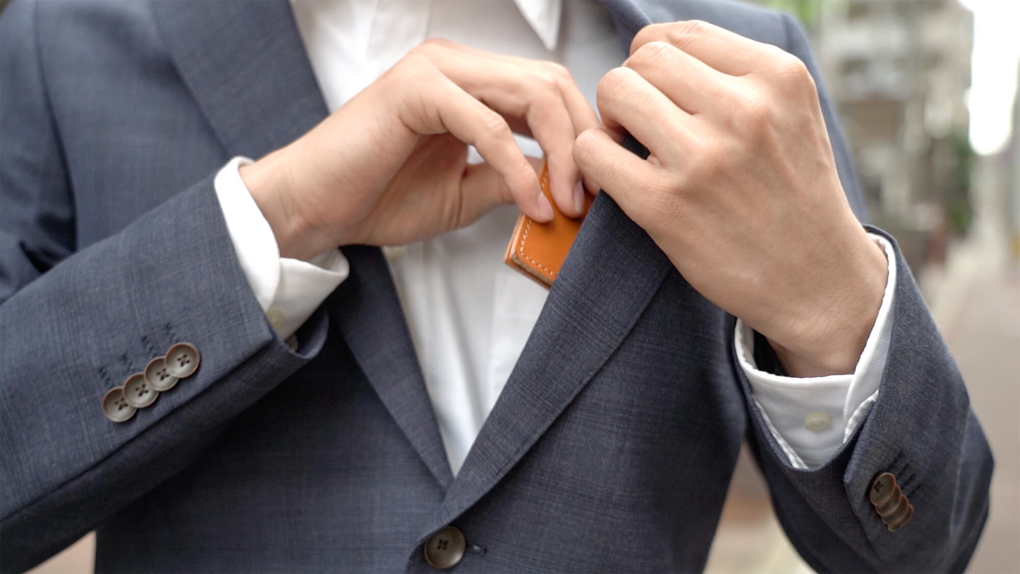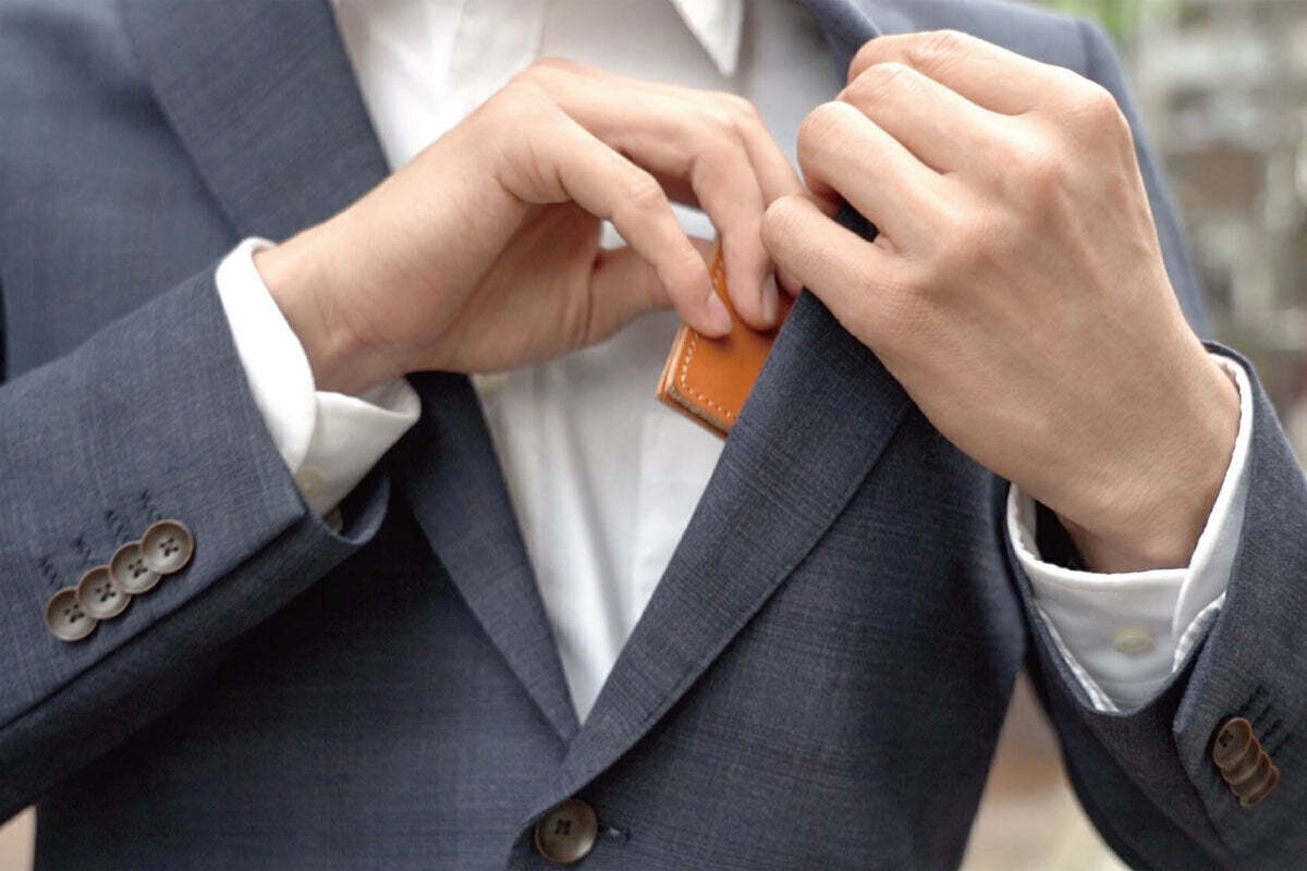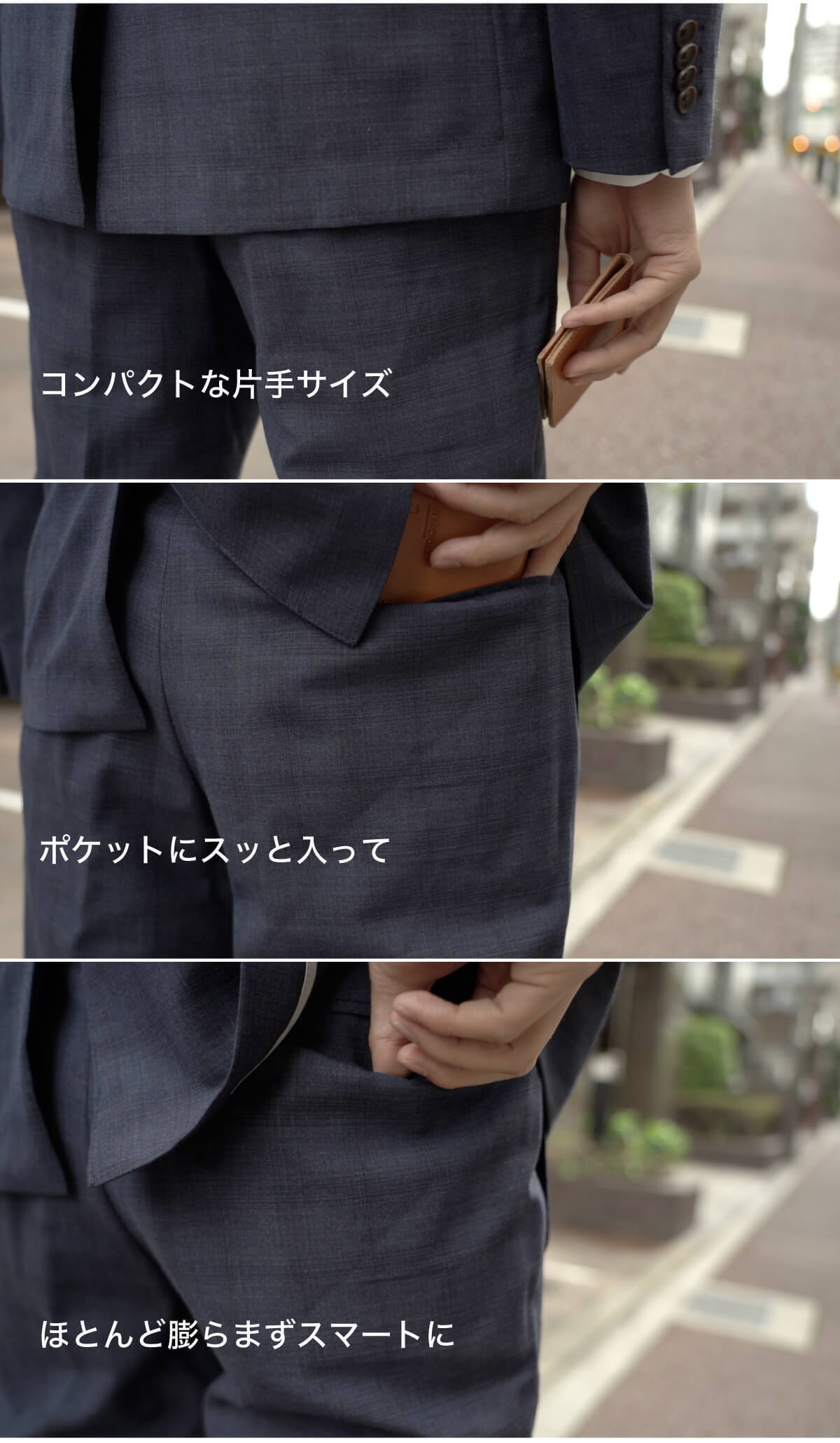 スリムなスーツ、ジャケットにも気軽に入れることができて、ストレスのない厚みに仕上げています。