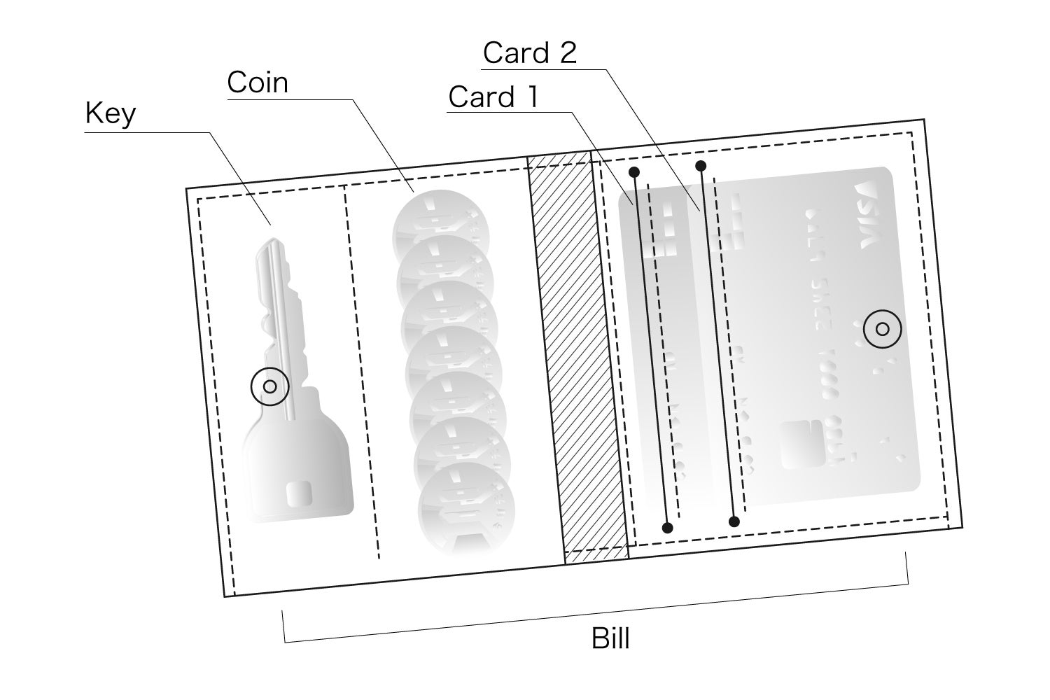 カードとコインの収納場所を左右に分散することで、閉じた時のサイズのコンパクト化に成功しました。