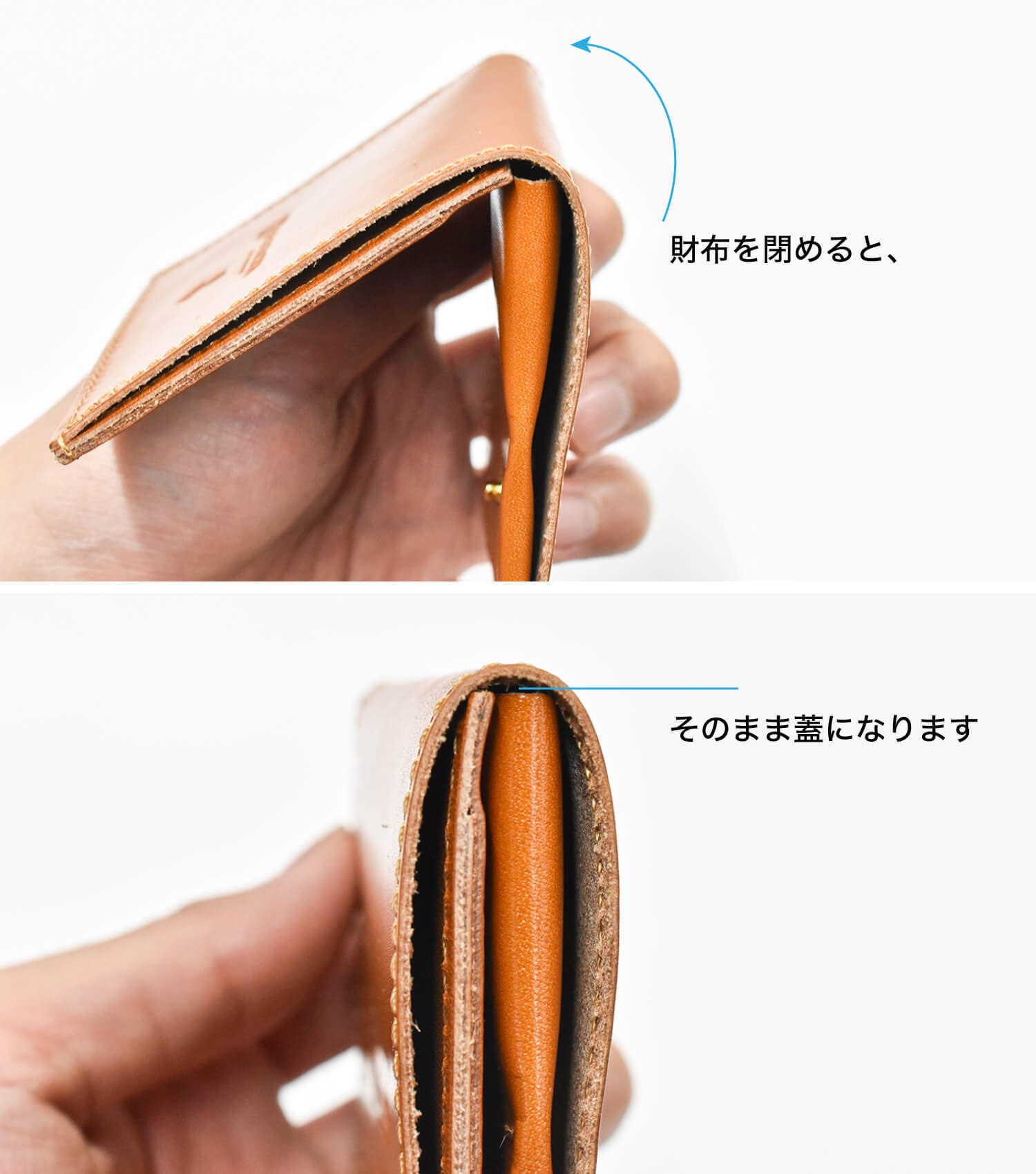釣り銭などで小銭が一時的に増えてしまった場合でも、折り畳む際にちょうどポケットに覆い被さるようにデザインされており、小銭の飛び出しを防いでくれます。