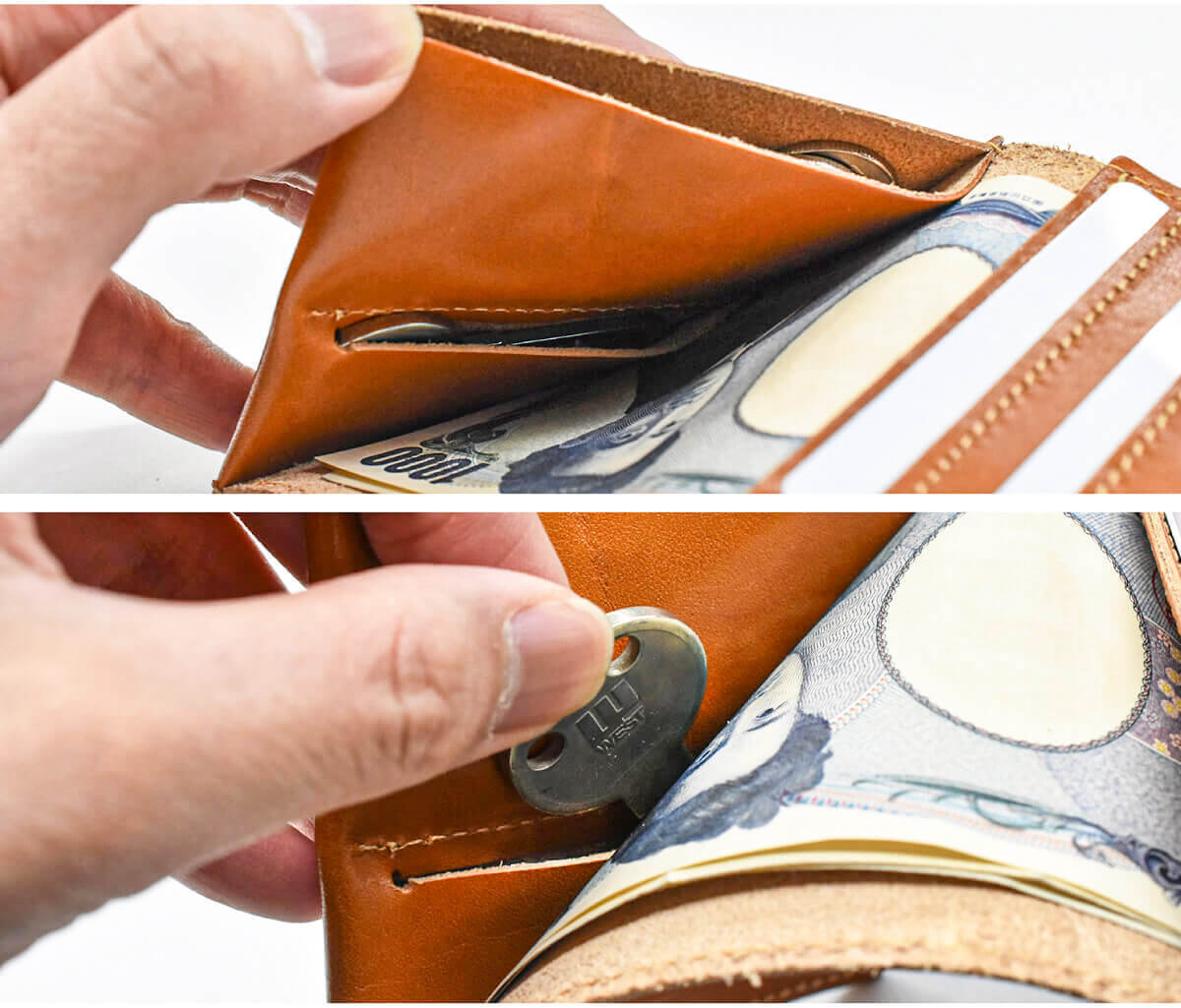 中央に取った1.4cmの空間が、蓋のないコインポケットを可能にしています。