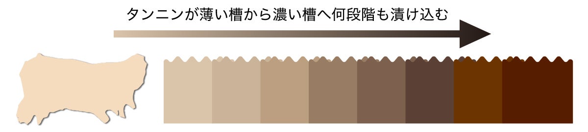 何段階もの濃度や成分が違った槽へと皮を漬け込む、時間と手間がかかる製法にこだわっています。