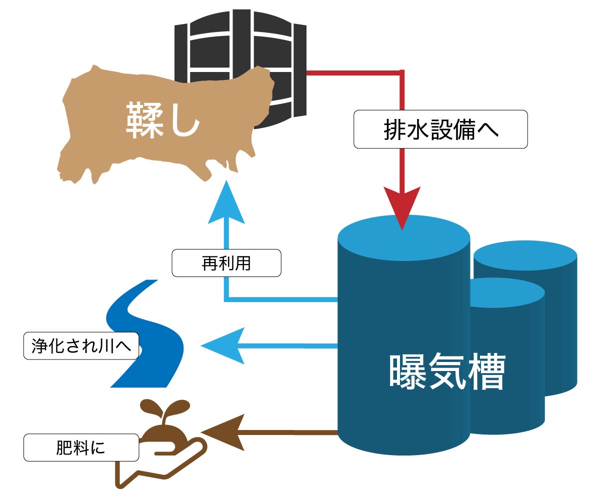 栃木レザーには大規模な排水設備が用意されています。9つの区画に分けれらた槽で、バクテリアや微生物によって段階的に汚水を中和させていきます。最終的に浄化された水の3分の1は原皮洗いに再利用され、それ以外は近くの河川に戻されます。