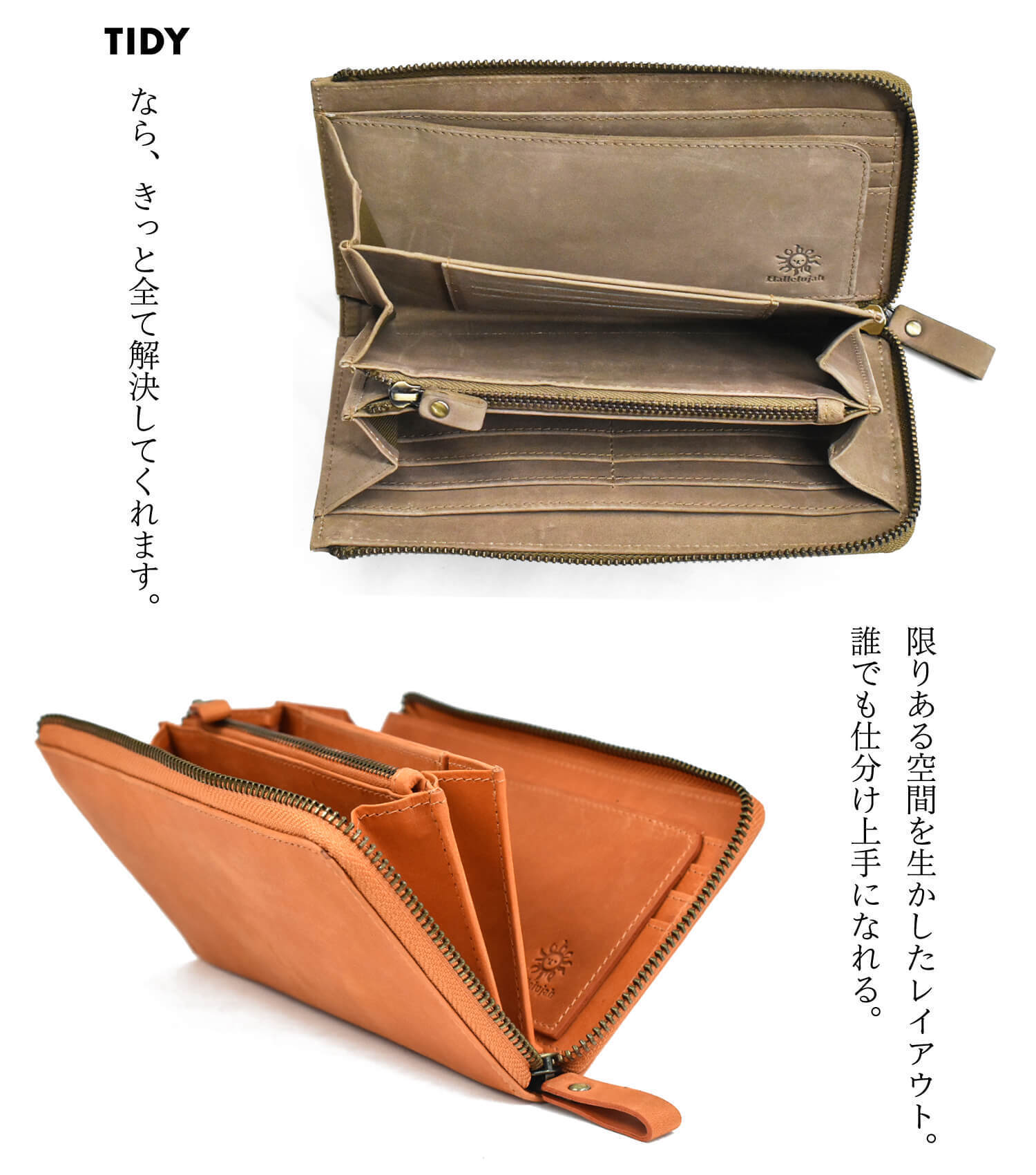 オールレザー長財布「TIDY - タイディ」は収納導線を考えた設計で財布の中を整理整頓できるだけでなく、オイルをたくさん含み経年変化しやすい、あなたが育てる財布です。