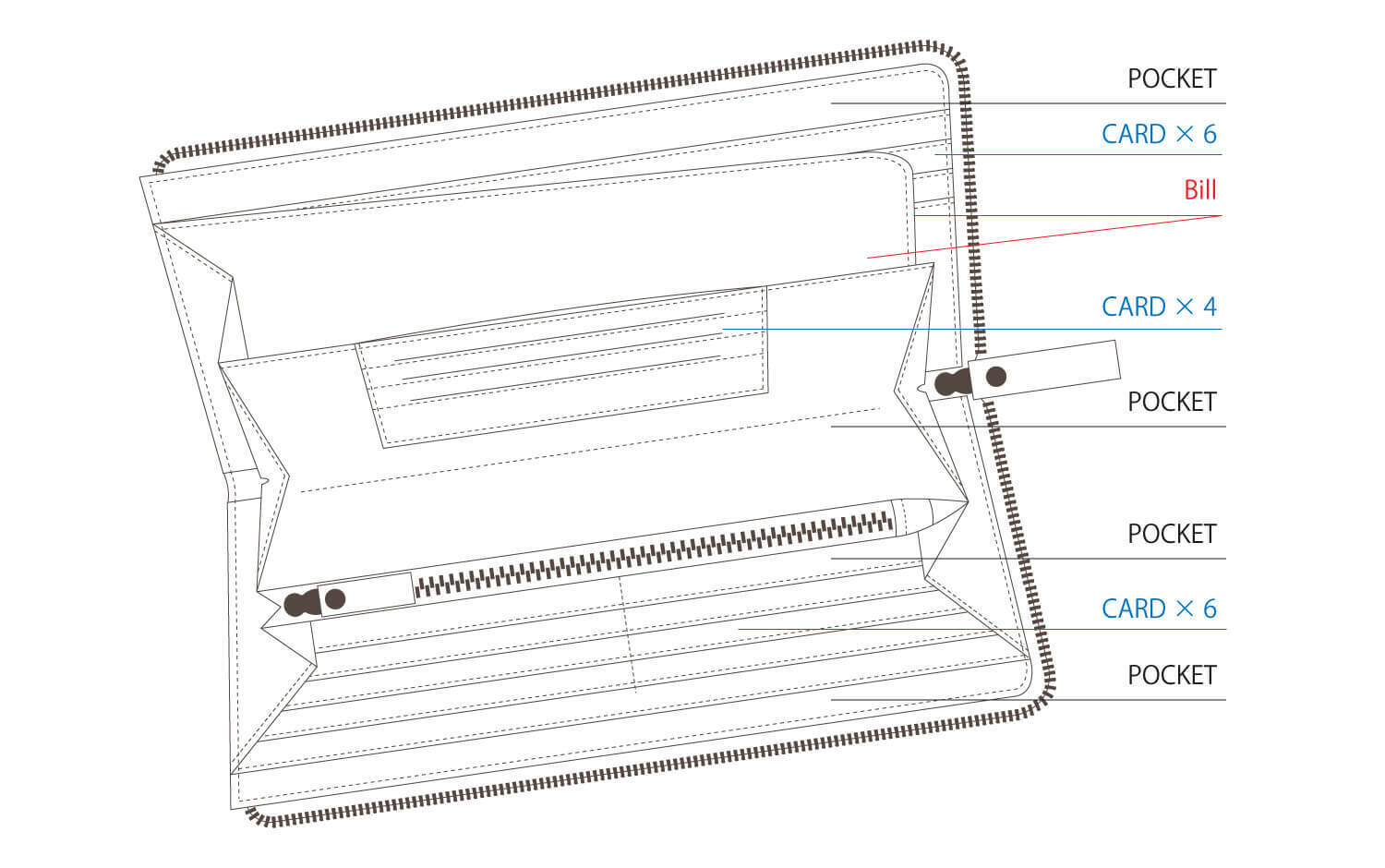 また、特徴的なお札仕切りや大きなマチで中身を瞬時に見渡せ、簡単に整理整頓ができます。