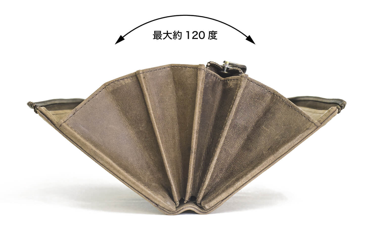 まるでアコーディオンのように折り畳まれたマチが開くことで、最大約120度まで広がります。