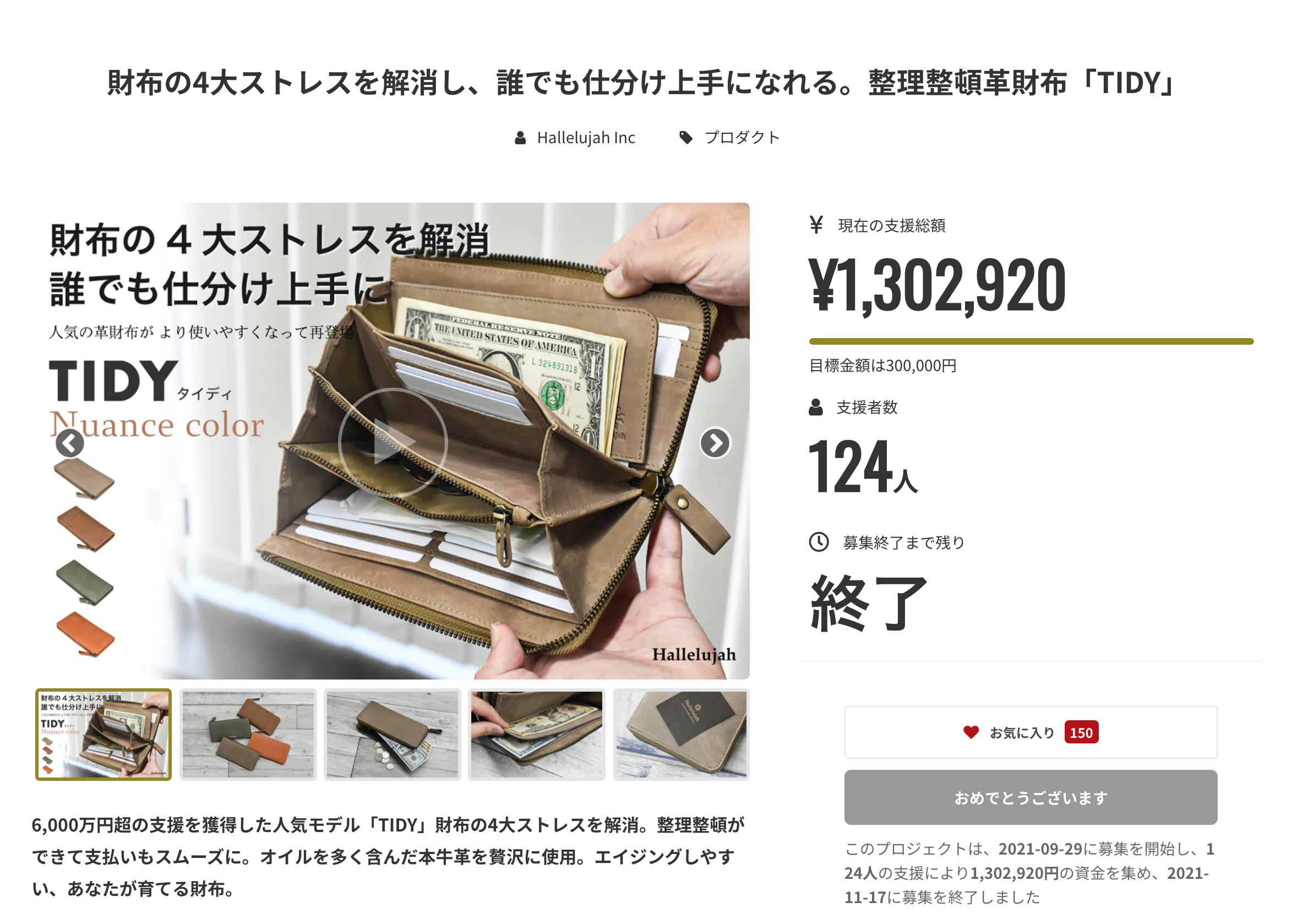 2021/11/18 10:17ご支援者の皆様。11月17日をもちまして TIDY - Nuance color - プロジェクトが終了となりました。ご支援者様「124人」ご支援金額「1,302,920円」と、沢山の方にご支援いただき心より感謝申し上げます。数あるプロジェクトの中、私たちの製品を選んでいただき本当にありがとうございます。皆様の普段の生活がほんの少しでも豊かに、便利になればこれほど嬉しいことはありません。ぜひ皆様に合った使い方で TIDYをお楽しみ下さい!【配送について】リターンに関してはお届け予定に沿って順次発送して参ります。詳細な日程が分かりましたら、活動報告にてお知らせいたします。※応援購入の際にご登録いただいた発送先住所に変更のある方は【11月30日(火)まで】にご変更をお願いします。商品の発送は12月末頃を予定しておりますので11月末時点のご登録の住所へ発送させて頂きます。Hallelujah もっと見る