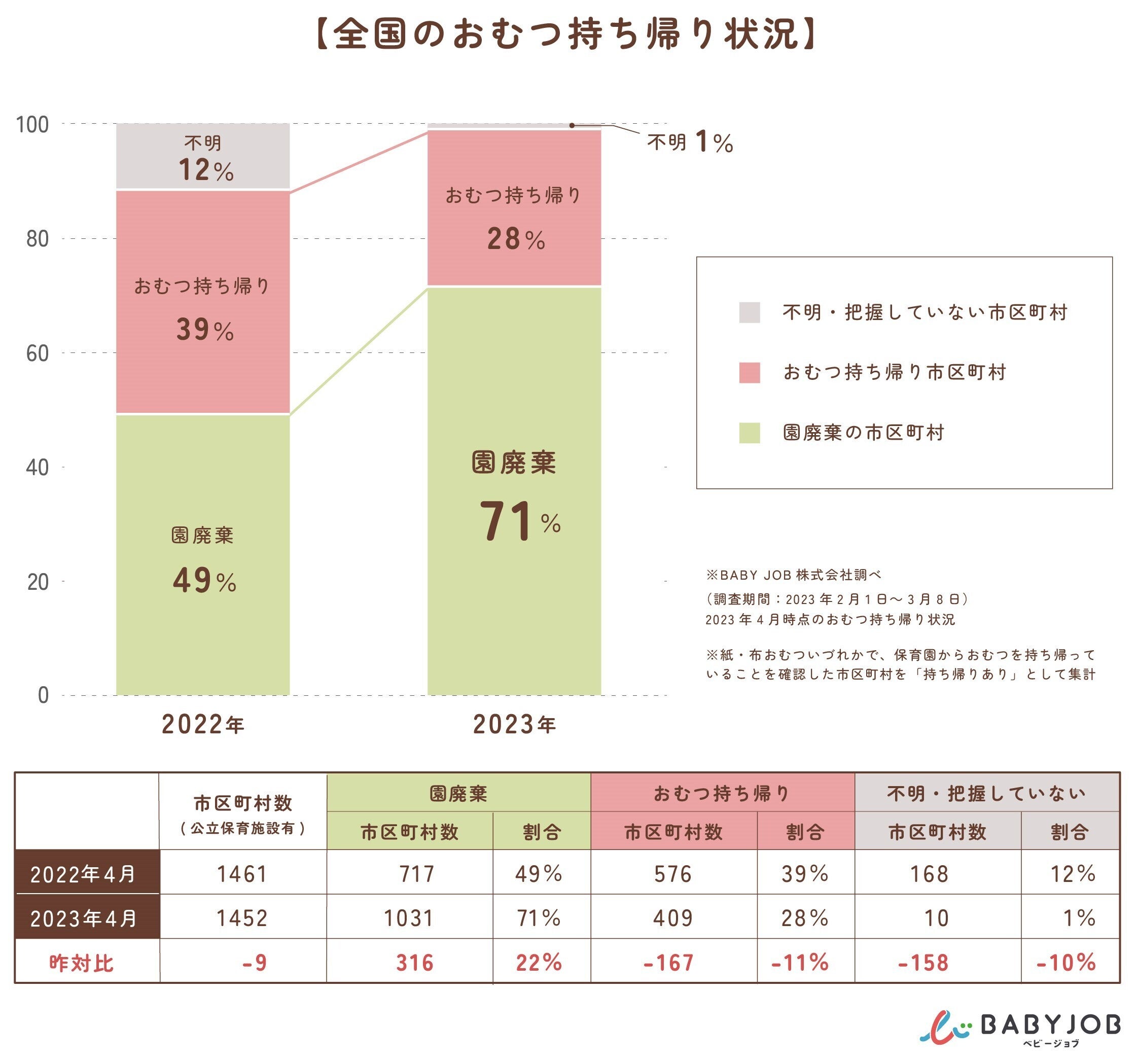 2023/03/24 17:53いつもご支援ありがとうございます。保育園からおむつの持ち帰りをなくす会です。今年も全国のおむつ持ち帰り状況を調査いたしました。結果として、前年と比べおむつを持ち帰らせている市区町村が167(11%)も減少しました。このような結果には、皆さまが応援をしてくださったおかげがあります。本当にありがとうございました。引き続き、保護者・保育士の負担を軽減し、子育てのしやすい環境に向けて 活動を続けてまいります。▼調査結果まとめhttps://prtimes.jp/main/html/rd/p/000000081.000038762.html もっと見る