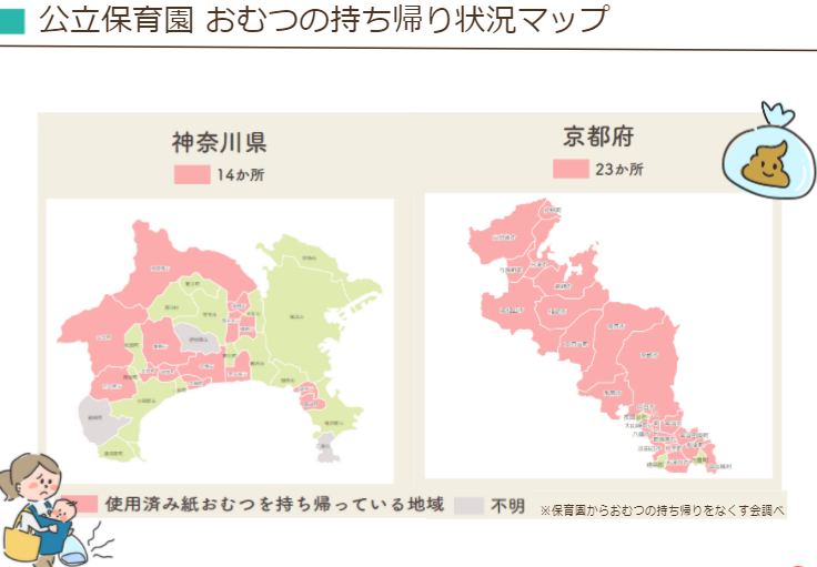 現在、使用済み紙おむつの持ち帰り問題は各自治体に任せられており、東京23区の多くの公立保育所では、おむつの持ち帰りルールを撤廃している一方で、他のエリアではまだまだ持ち帰りが行われるなど、各自治体によって、おむつ持ち帰り問題の対応にばらつきが出ています。