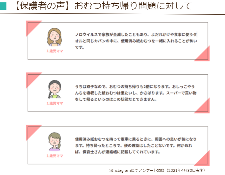 仕事をしている人しか保育園に子どもを預けられないため、仕事の荷物を持った状態で使用済み紙おむつを持ちかえる人が大半だと思います。もちろん荷物の量が多くなることの負担もありますが、それ以上に衛生面や臭いの面で悩みを抱える保護者が非常に多いです。