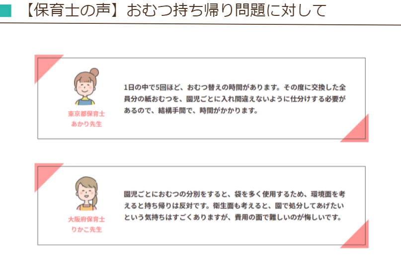 また、この使用済み紙おむつの持ち帰り問題は、保護者だけではなく保育士も困っているルールです。