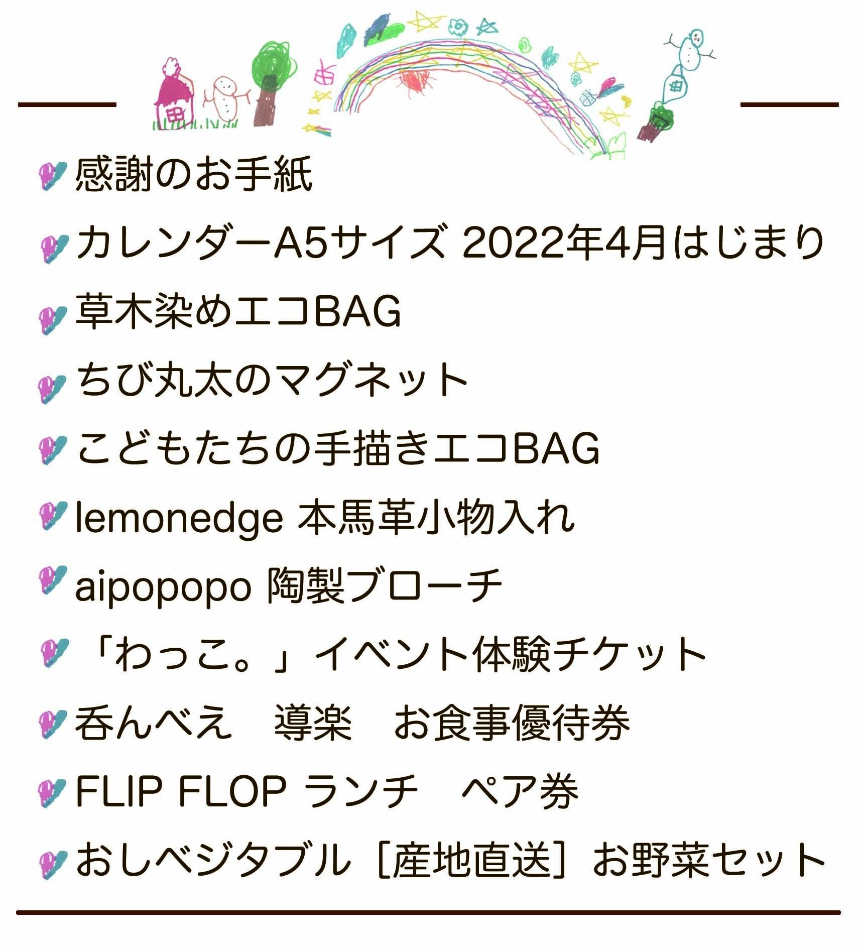 2022/03/04 15:38こんにちは!温かい日差しが増えてきて、スタッフ一同春を心待ちにしています(^^)♪皆様お元気でお過ごしでしょうか?改めまして、この度のクラウドファンディングにおいては、温かいご支援誠にありがとうございました。資金面だけでなく、お言葉や出逢いや運営面での沢山のご支援を頂いております。今回のクラウドファンディングを立ち上げるにあたり、『自分達に出来るのか』と葛藤した時もありましたが、皆様のおかげで沢山の喜びと学びをいただく事が出来ました。本当にありがとうございました。お陰様で、野あそび舎わっこ。クラウドファンディングで皆様から頂いたご支援を元に、様々な運営の改善を目指し具体的に検討を重ねています。クラウドファンディングスタッフは勿論のこと、【野あそび舎わっこ。】に関わる全ての人が大きな喜びと感謝に包まれながら、3月に入った今は、これからの卒園入園準備に向け準備が進んでいます。子ども達の門出を祝う嬉しさと、毎日共に過ごしてきた仲間たちとの別れの時が近づいてきた寂しさを感じながら、1日1日をみんなで大切に過ごしています。別れと出会の季節は何度訪れて経験しても、私たちの心を豊かにしまた一歩前へと進めてくれるものだなと感じています。また、至らない点があり、支援者様へ直接ご連絡を送らせていただいております。ご心配をお掛けして申し訳ございませんでした。一層気を引き締め、精進して参りますので、今後とも変わらぬご支援を宜しくお願い申し上げます。前置きが長くなりましたが、今回は、皆様へのご報告を投稿させていただきます!先日、返礼品の発送作業をいたしました。手紙は、こどもたちの描いたものを組み合わせて印刷しました。カレンダーはこどもたちが描いたものをもとに、印刷したものを、お母さん方が製本テープでまとめるなど、作業いたしました。こどもたちと、染めたエコバッグは「タグつけるよ」手をあげてくれた、おかあさんがタグをつけてくれました。ちび丸太の磁石は、ちょうど良い枝を探しカットして、処理をしたあと、マグネットも何がいいかスタッフで検討して作業しました。手描きのエコバッグはこどもたちが、アクリル絵の具で、のびのび描いてくれました。これらを、一つ一つ確認しながら封筒に入れ、住所とお名前を確認しながら書かせていただきました。そして、いろんなところからのご支援に、改めて感謝いたしました。出来上がって封をしたものは、どれも愛おしく一つ一つどれもが、野あそび舎わっこ。のこどもたち、お母さん、スタッフ…みんなで作った返礼品です。温かい皆様のお手元へお届けいたします。 もっと見る
