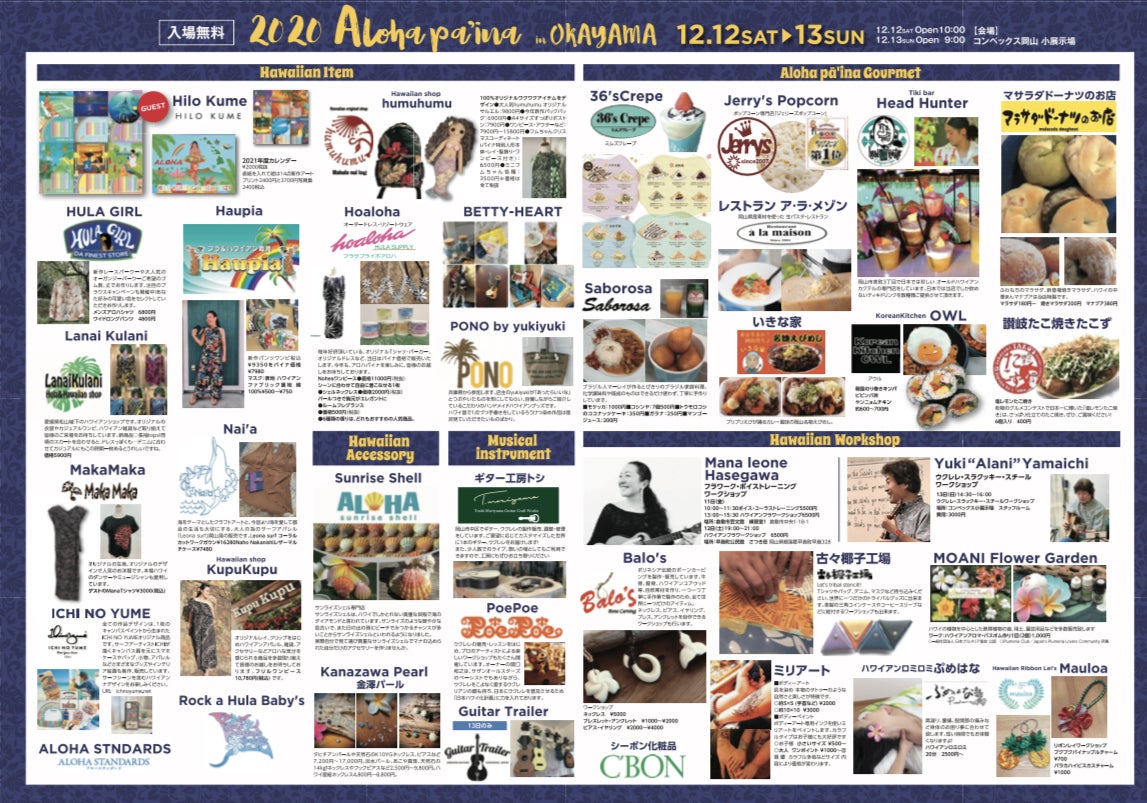 日本でもハワイアンスラックキー1人者である山内アラニ氏、が命名してくださり、開催当初から企画にも参加してくださったハワイアンイラストレーターであるHilo Kume氏も協力していただいた甲斐もあり毎年12月に素晴らしいハワイのイベントを開催することができました。県外にもあるハワイアンイベントを瀬戸内の美しいしまなみをもった瀬戸内の海や倉敷美観地区等の観光も含め、県内で開催したく暖めてきました。沢山のイベントを重ねるうちに素晴らしい出店者やアーティスト、フラダンサーに出会え、5年前から素敵な方を迎えてイベントを開催することが叶っています。フラダンサー・出店も四国や、九州、大阪、名古屋などいろんな県外からやってくる1年を締めくくる温かいイベントとなっております。